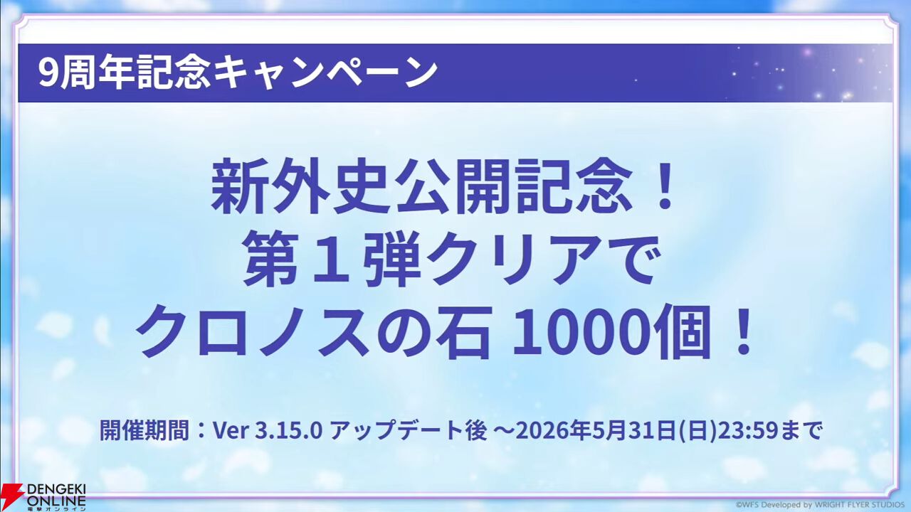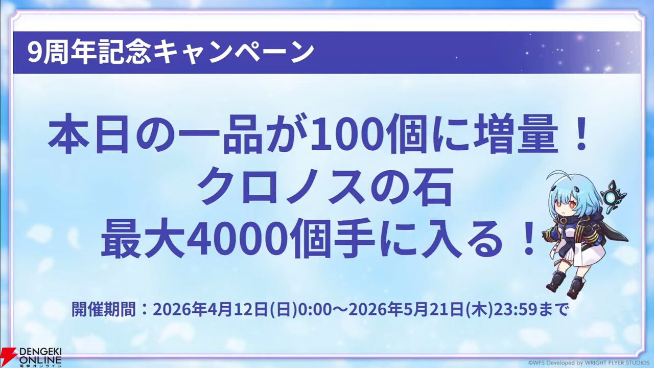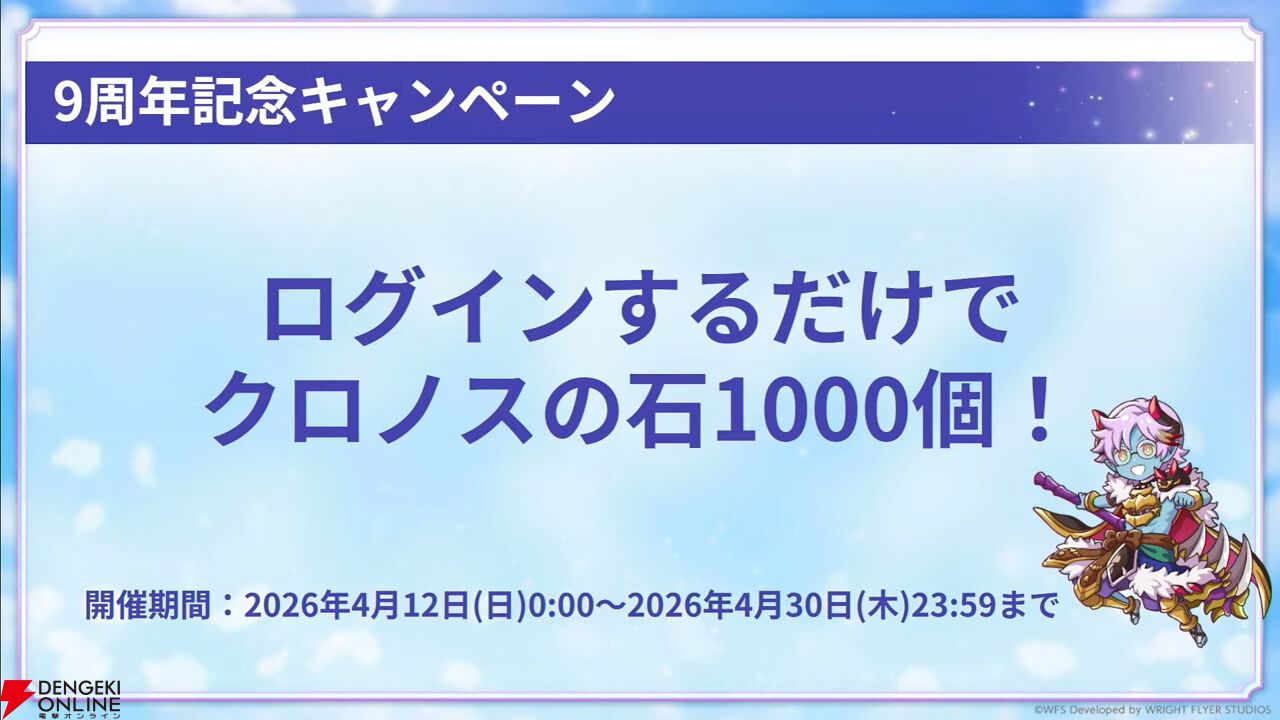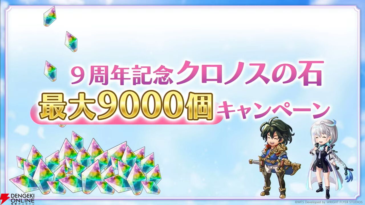 9周年キャンペーンとして、クロノスの石が手に入るログインボーナスなどが開催。すべて達成するとクロノスの石が合計9000個手に入ります。