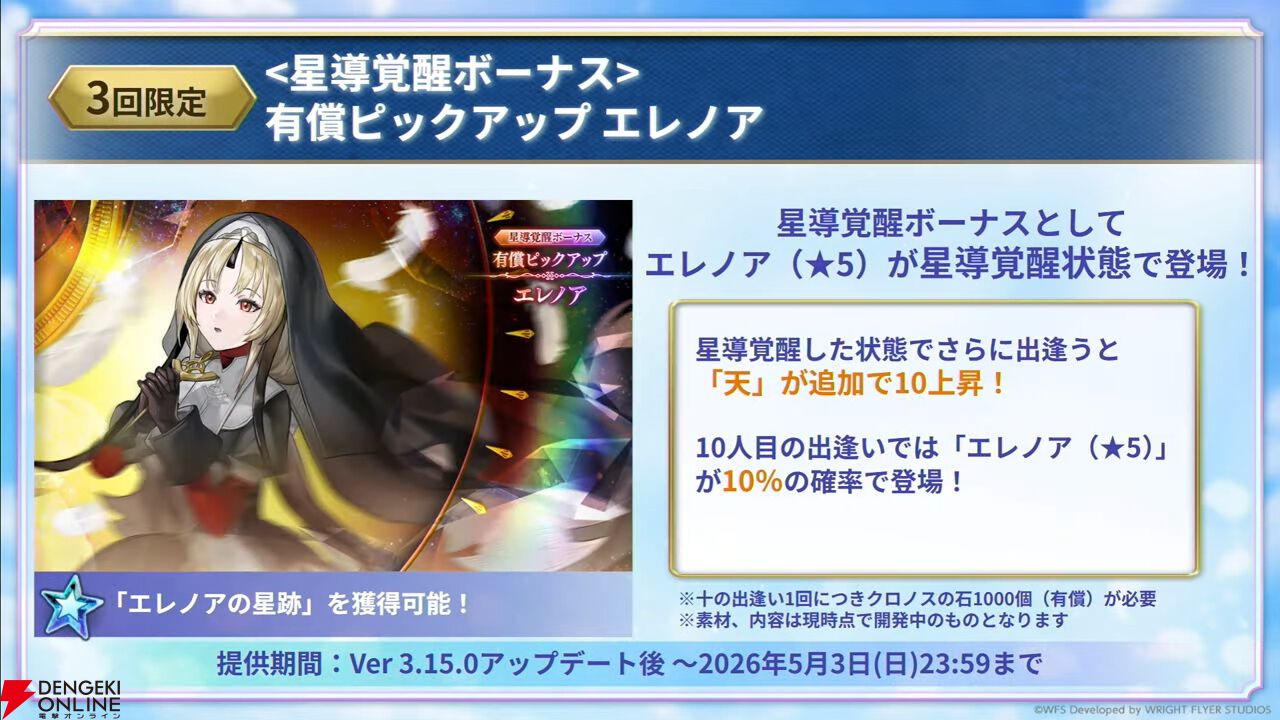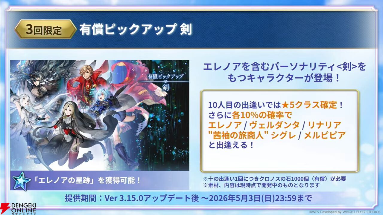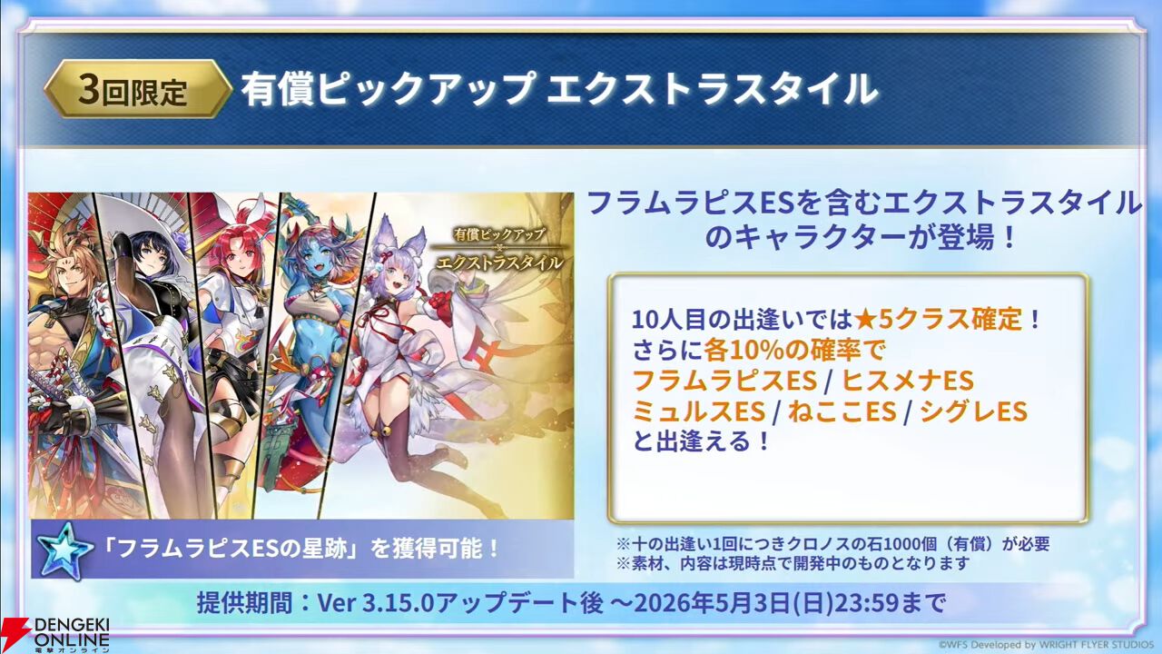 新外史第1弾“幻霊の剣と祈誓の灯火”にも登場するエレノアと、フラムラピス(エクストラスタイル)が追加されます。