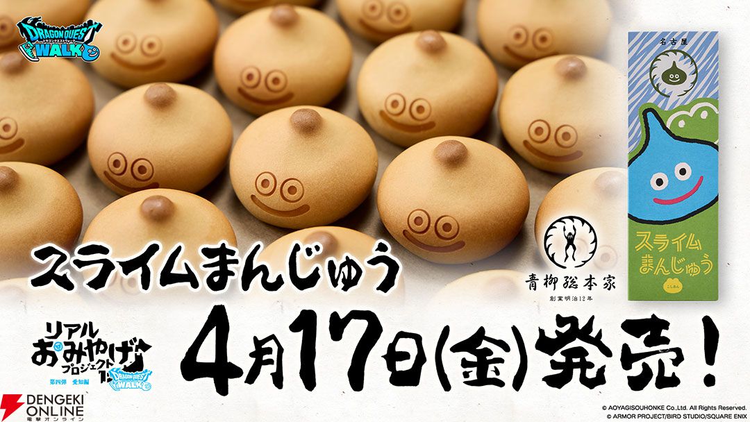 リアルおみやげプロジェクト第四弾愛知編として“スライムういろう”を製造・販売する青柳総本家と新しくコラボレーションした商品“スライムまんじゅう”が、“ドラゴンクエストウォーキング<中部>”の開催にあわせて新発売されます。青柳総本家の人気商品“カエルまんじゅう”がかわいいスライムのおまんじゅうに!