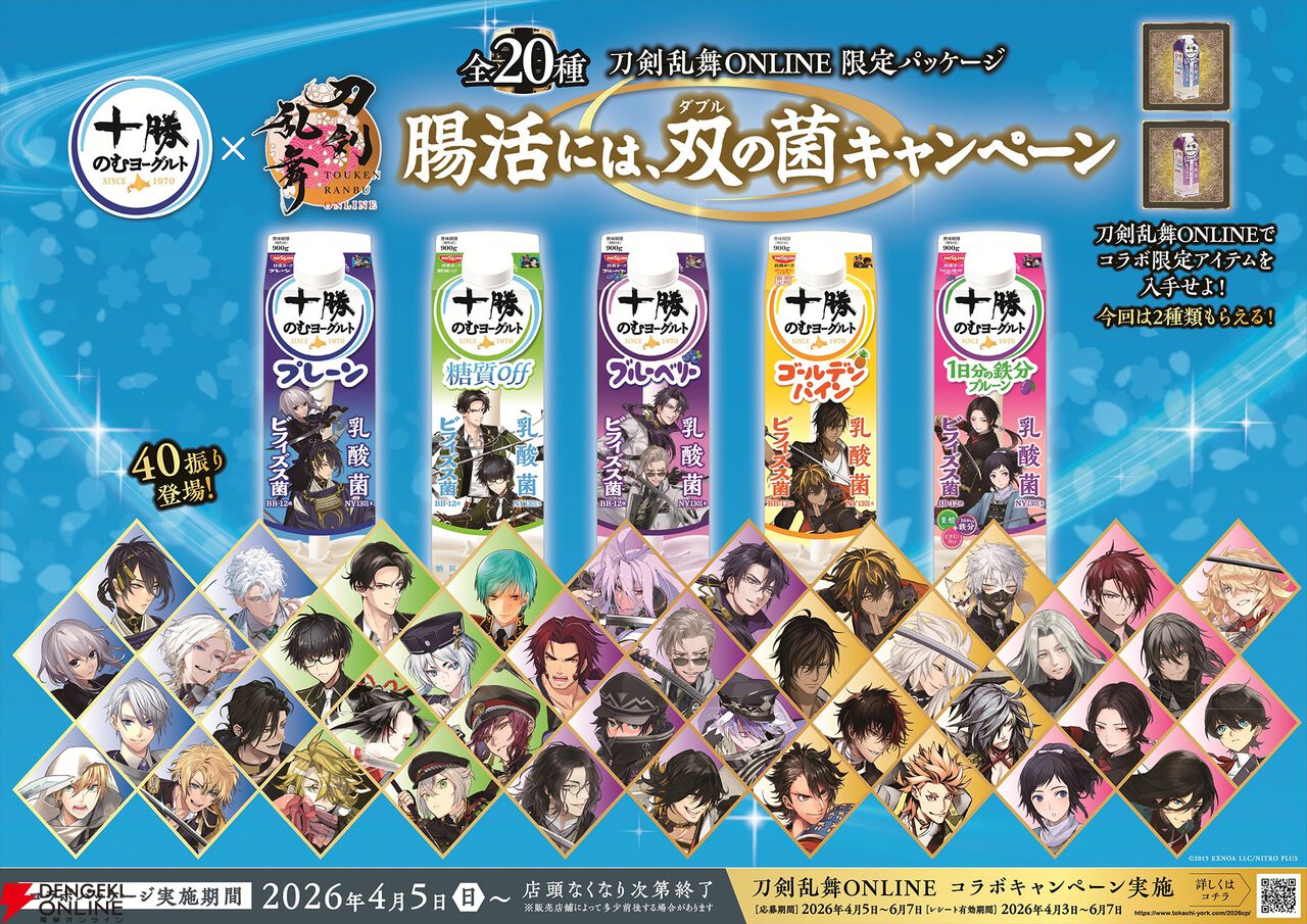 日清ヨークは、「十勝のむヨーグルト」と『刀剣乱舞ONLINE』のコラボレーションの一環として、本日4月6日より限定パッケージ20種を発売しています。