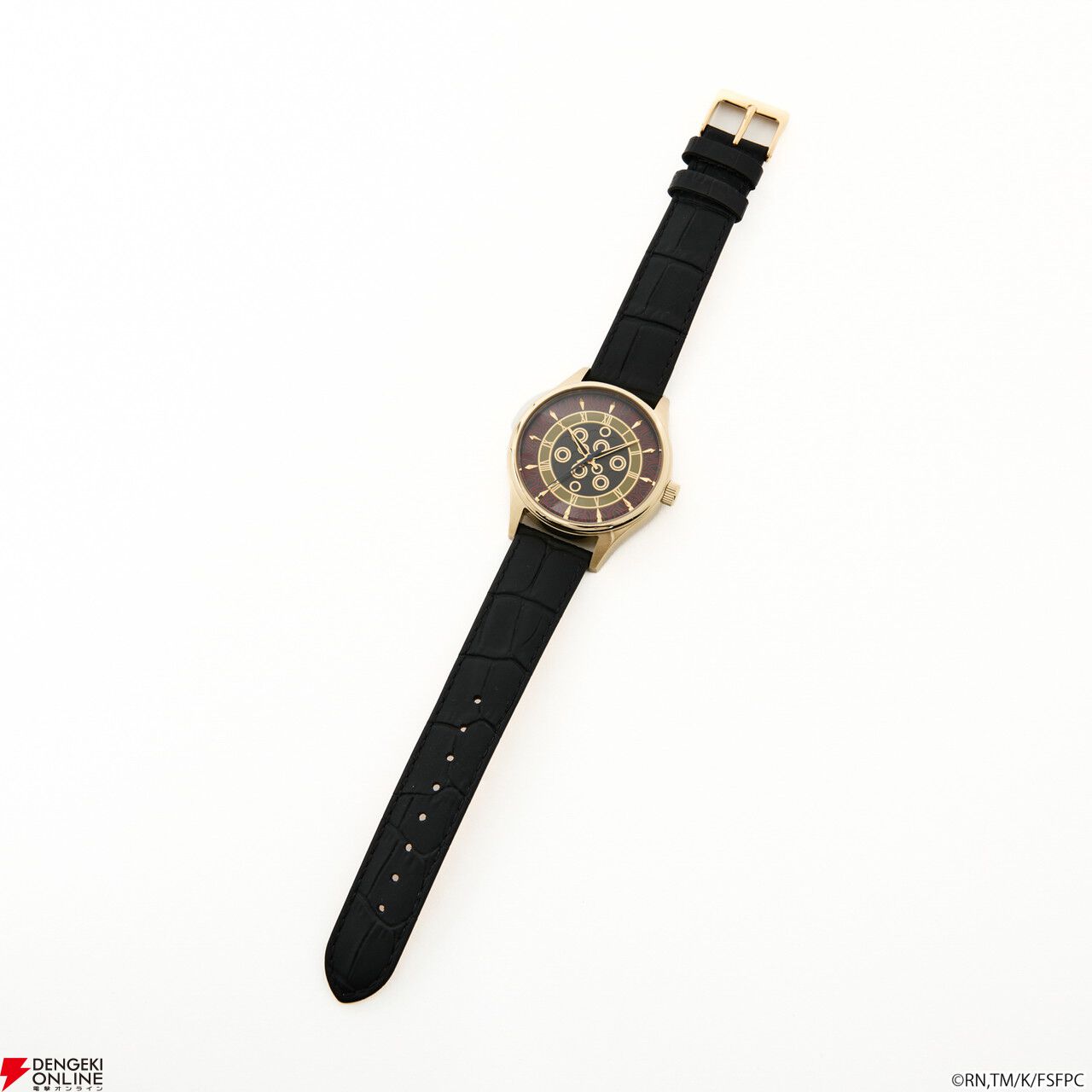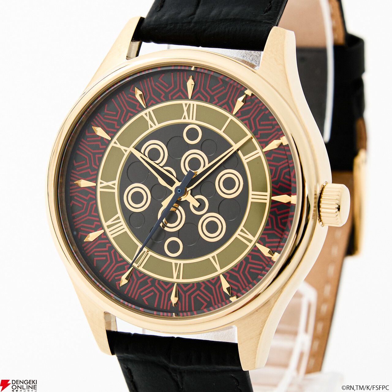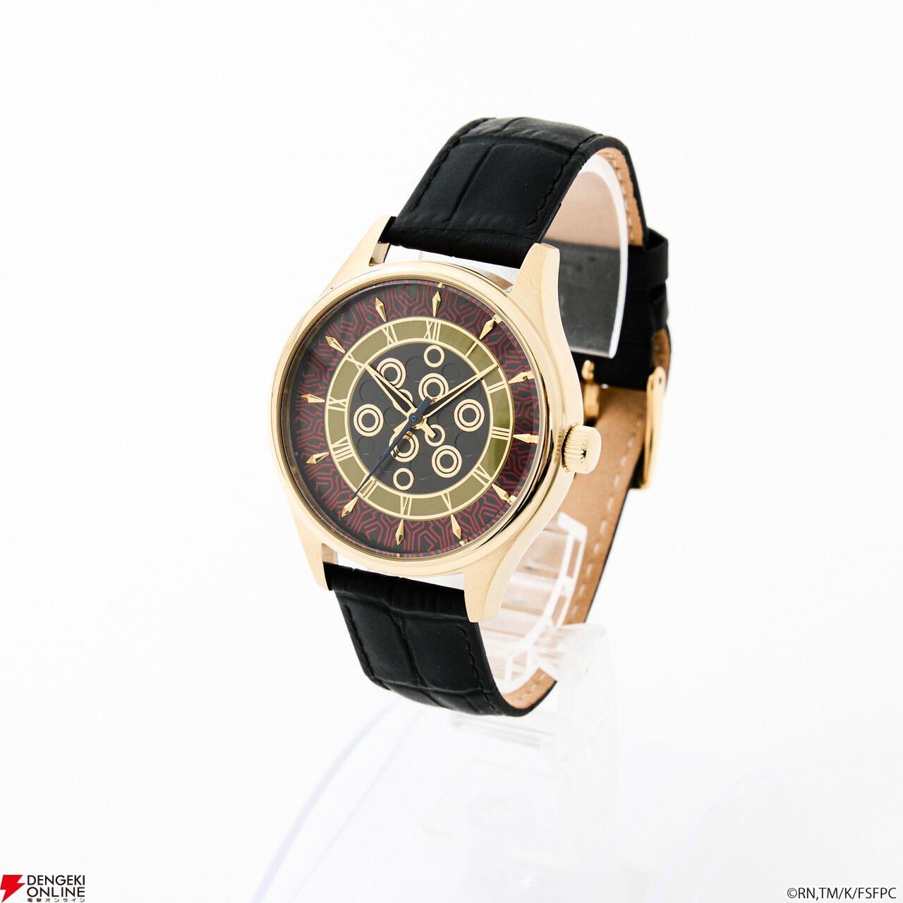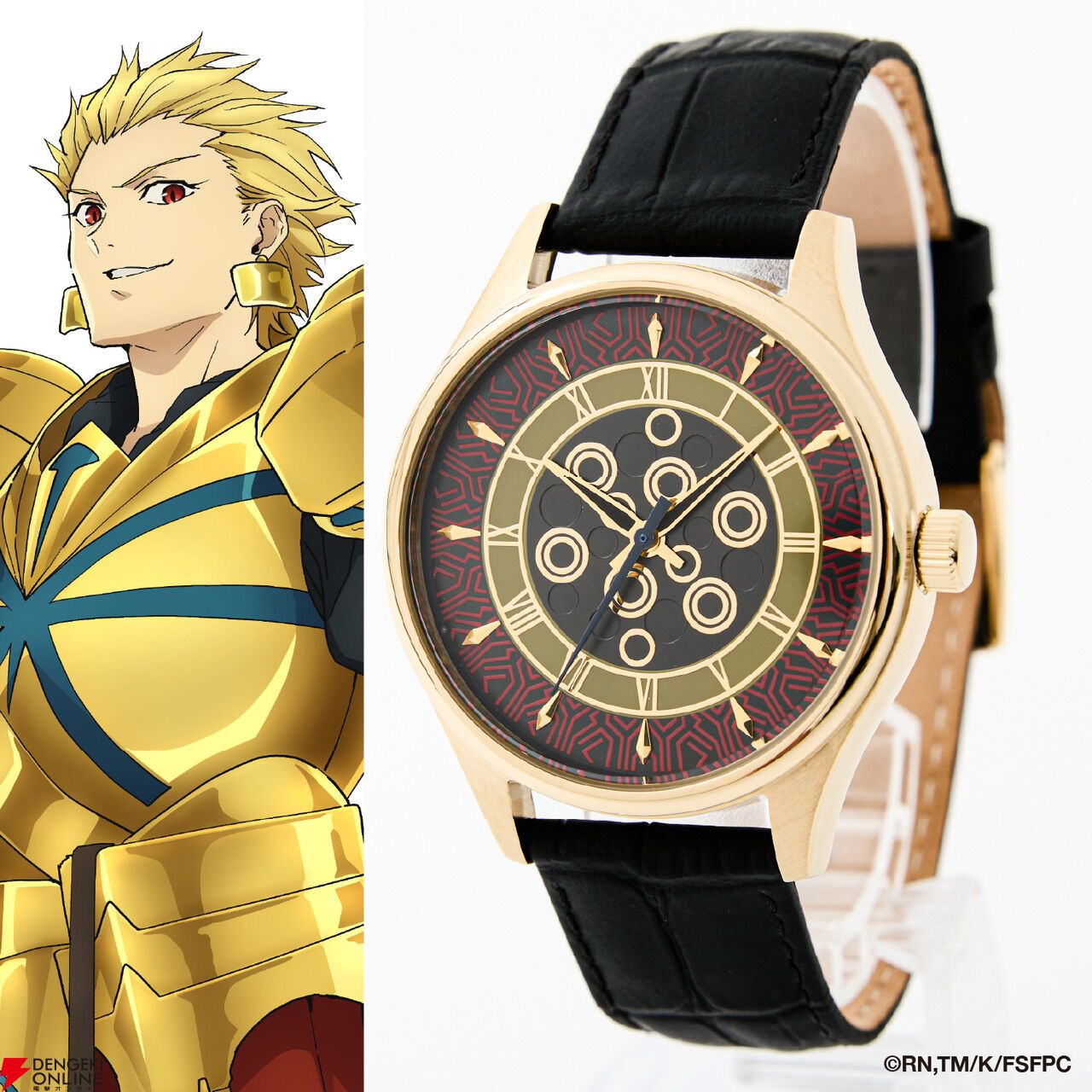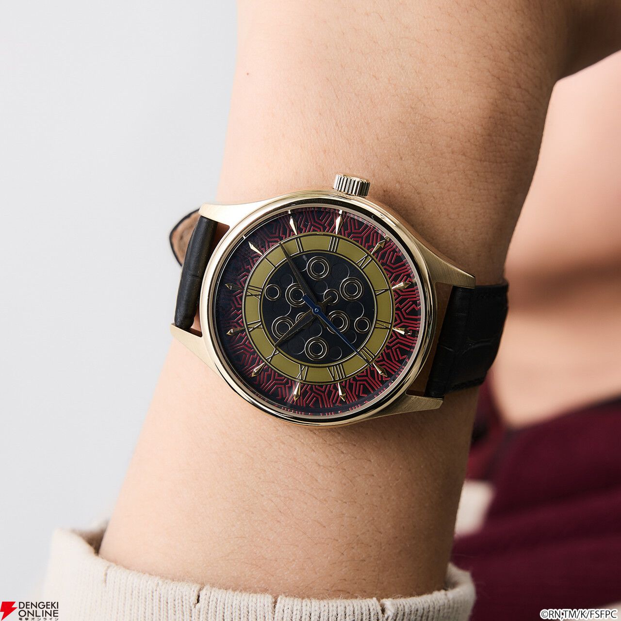 腕時計の盤面中央には、「王の財宝<ゲート・オブ・バビロン>」をイメージしたエッチングを施し、インデックスや金属パーツで、宝具が放たれる様を演出。