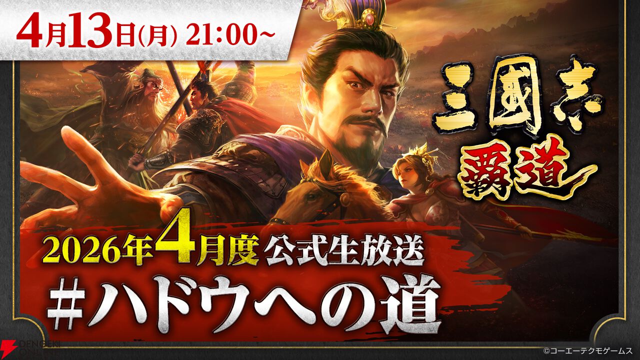 コーエーテクモゲームスは、Steam/スマートフォン用MMO戦略シミュレーションゲーム『三國志 覇道』にて、4月13日21:00より生放送番組“『三國志 覇道』4月度公式生放送 #ハドウへの道”の実施を発表しました。