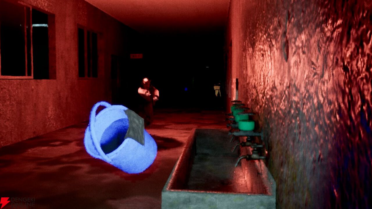 自身のライトの色が、色鬼の指定色と一致していれば、プレイヤーは色鬼には襲われません。色鬼に追いかけられ、絶望する中でも、廊下に転がっている青いバケツが命を救う──。そんなギリギリでのスリルを体感することができます。