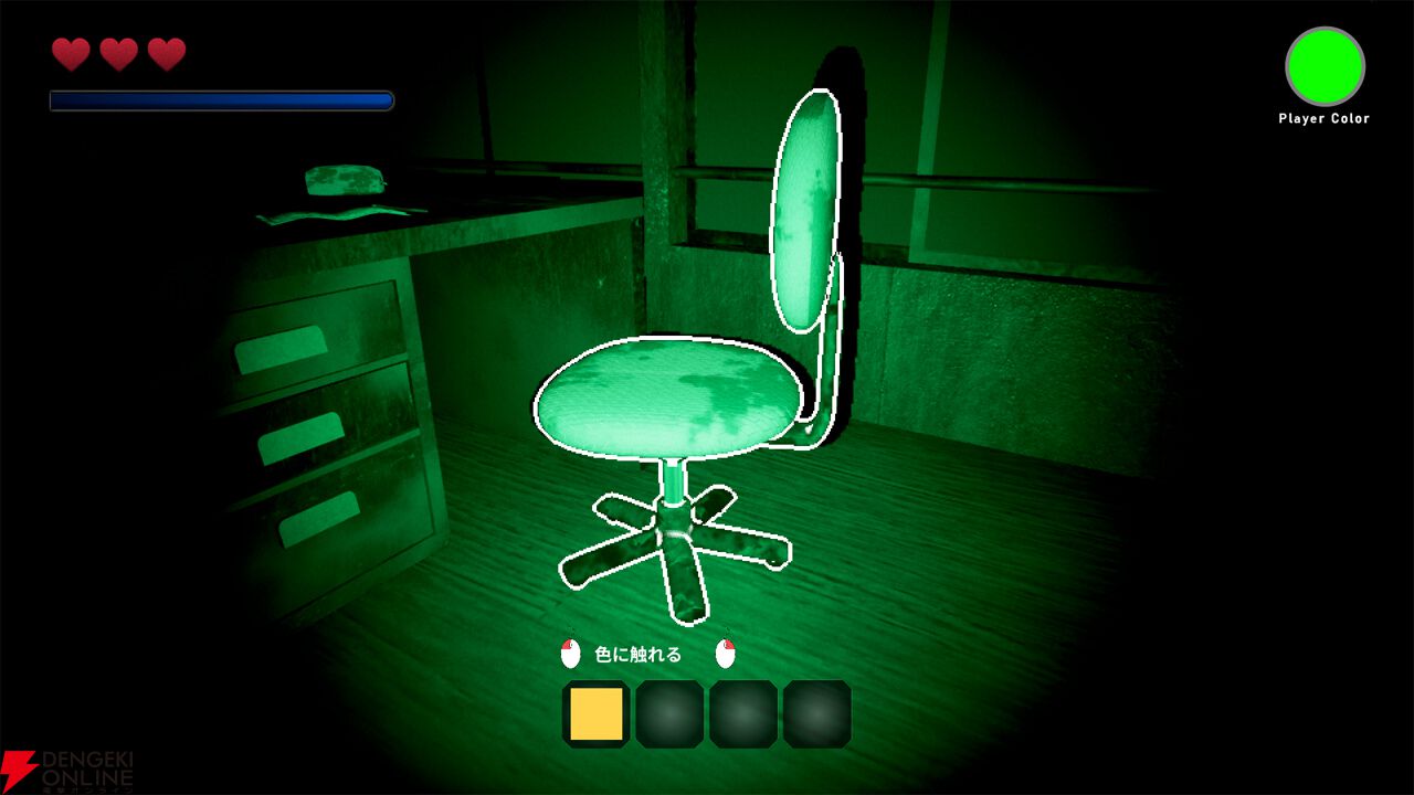 本作の最大の特徴は、逃げる・隠れるだけではない“色を見つけて、触れる(ライトの色を変える)”という新たな生存方法です。この独自のルールによって、間一髪で色に触れ、ゲームオーバーを回避でき、最後の最後まで助かるかもしれないというスリルを生み出します。
