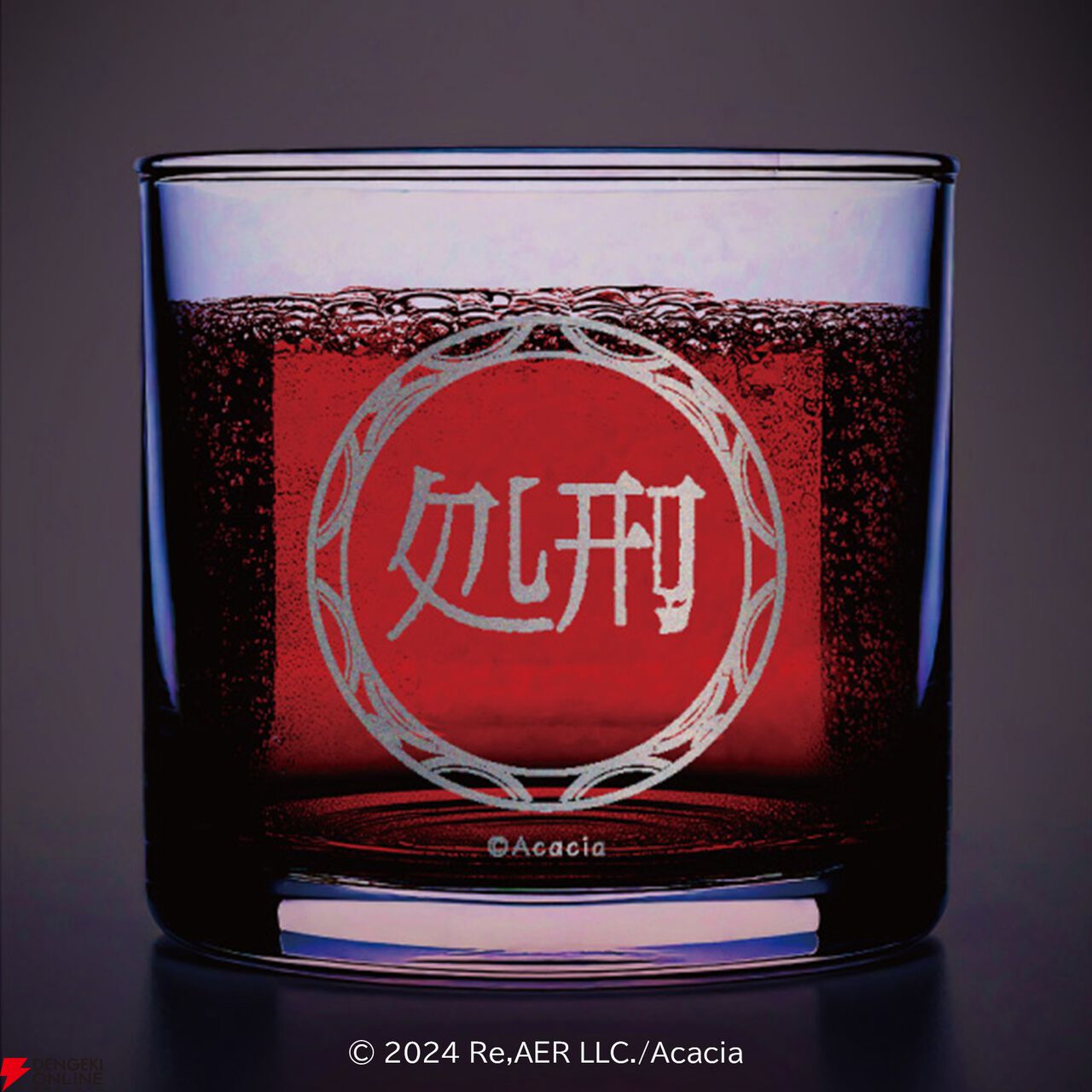 『魔法少女ノ魔女裁判』処刑ボタングラスは、“処刑ボタン”をあしらったロックグラスです。ぐーっと飲み物を注いでいただけますと……?