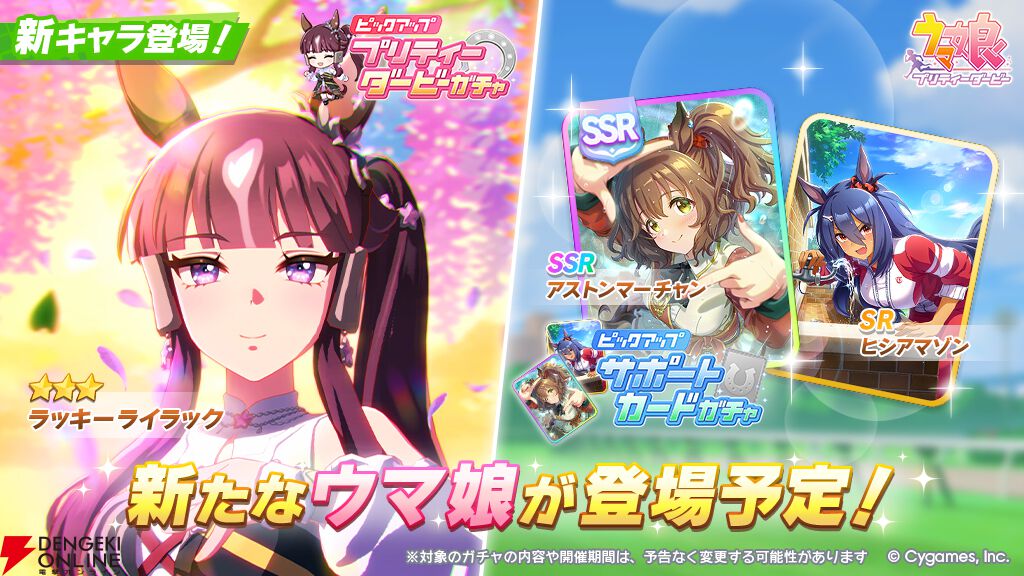 ゲーム『ウマ娘 プリティーダービー』にて4月10日に更新されるガチャ情報が公開。新育成ウマ娘はラッキーライラック、新サポカは根性のアストンマーチャンです。