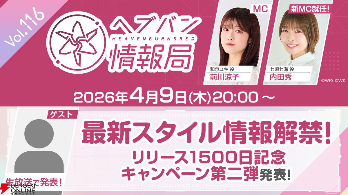 ライトフライヤースタジオ×Keyが贈る、ドラマチックRPG『ヘブンバーンズレッド』は、2026年4月9日(木)20:00より公式YouTubeチャンネルにて、公式番組「ヘブバン情報局 Vol.116」を生放送します。