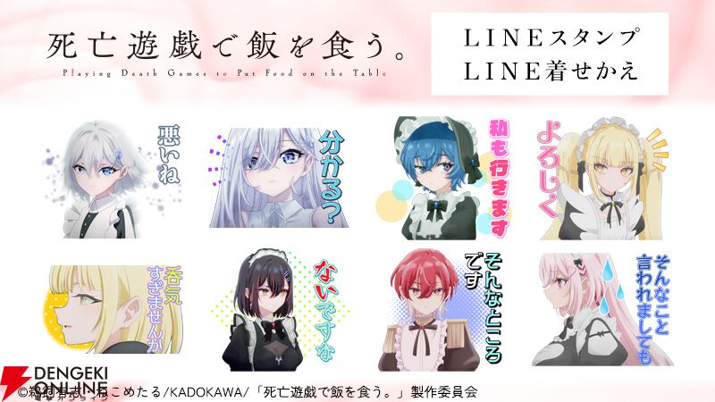 Creative Plusは、アニメ『死亡遊戯で飯を食う。』LINEスタンプ・着せかえの配信を開始しました。