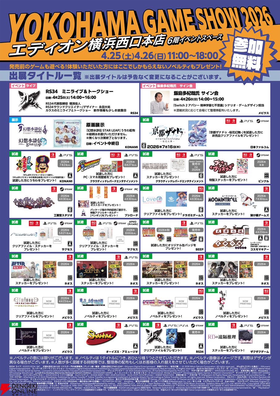 “YOKOHAMA GAME SHOW 2026”は、4月25日(土)と26日(日)にエディオン横浜西口本店6Fイベントスペースにて開催される、発売前のゲームの試遊などができるイベントです。