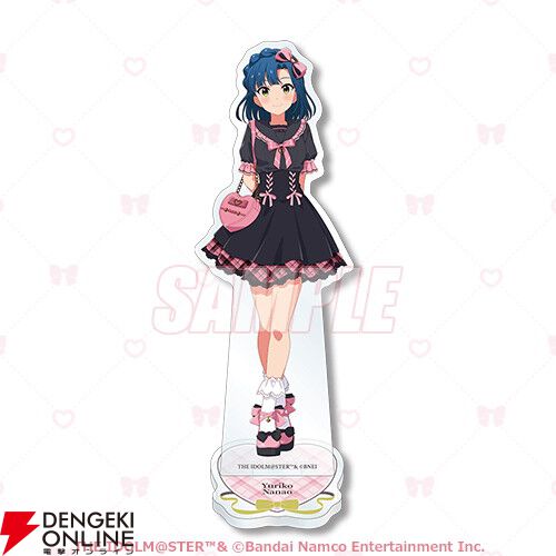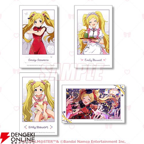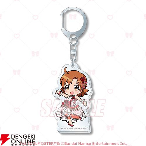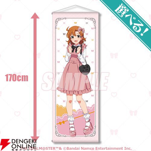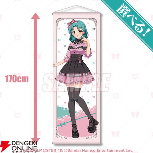 商品は今回のために描き下ろされたガーリーな衣装に身を包んだ「春日未来」「徳川まつり」「矢吹可奈」「七尾百合子」「エミリー スチュアート」の特大タペストリーやアクリルスタンドのほか、アイドルたちのちびキャラアクリルキーホルダー、カードイラストを使用したミニブロマイド4枚セットや缶バッジ等、ファン必携のアイテムが盛りだくさんです。