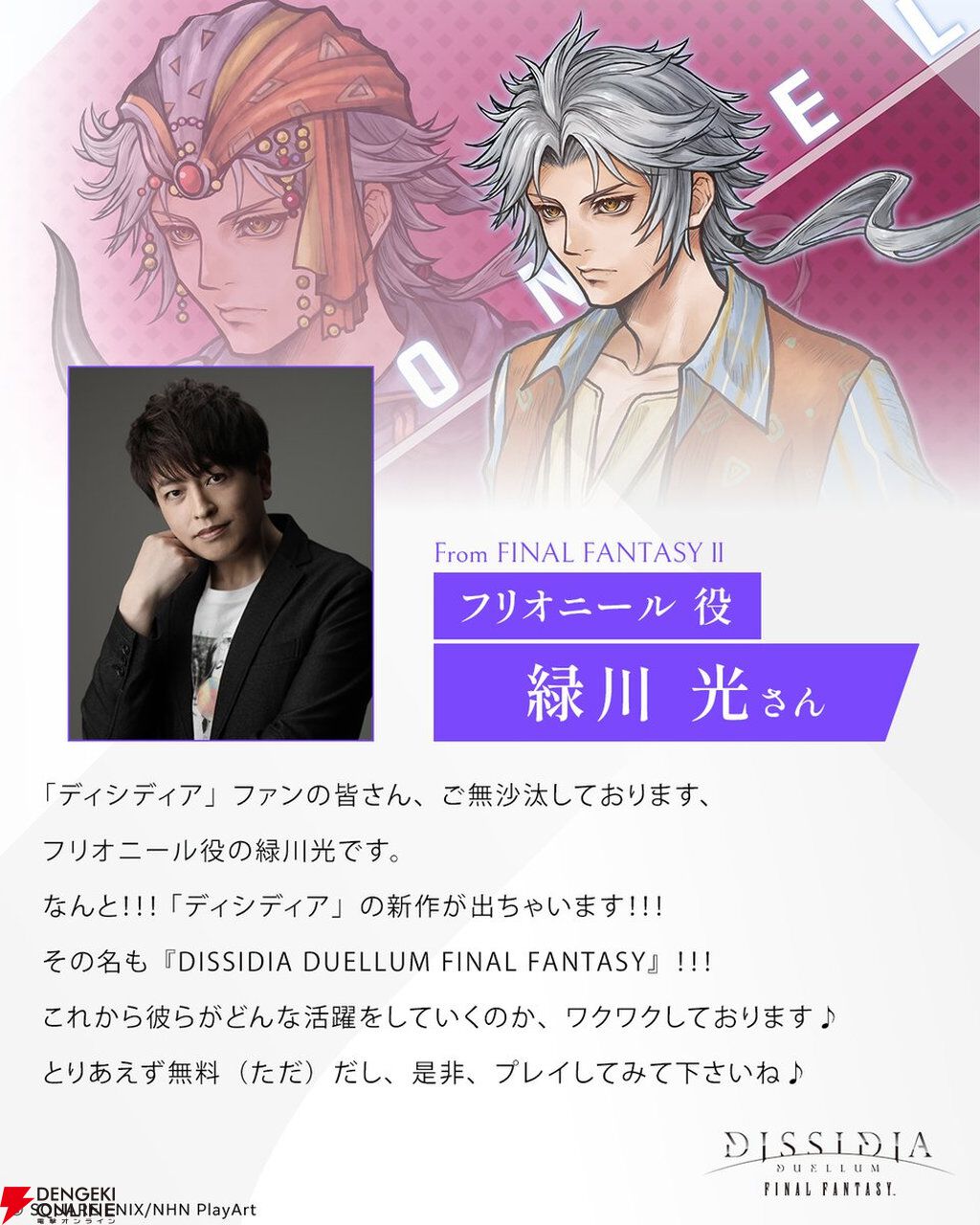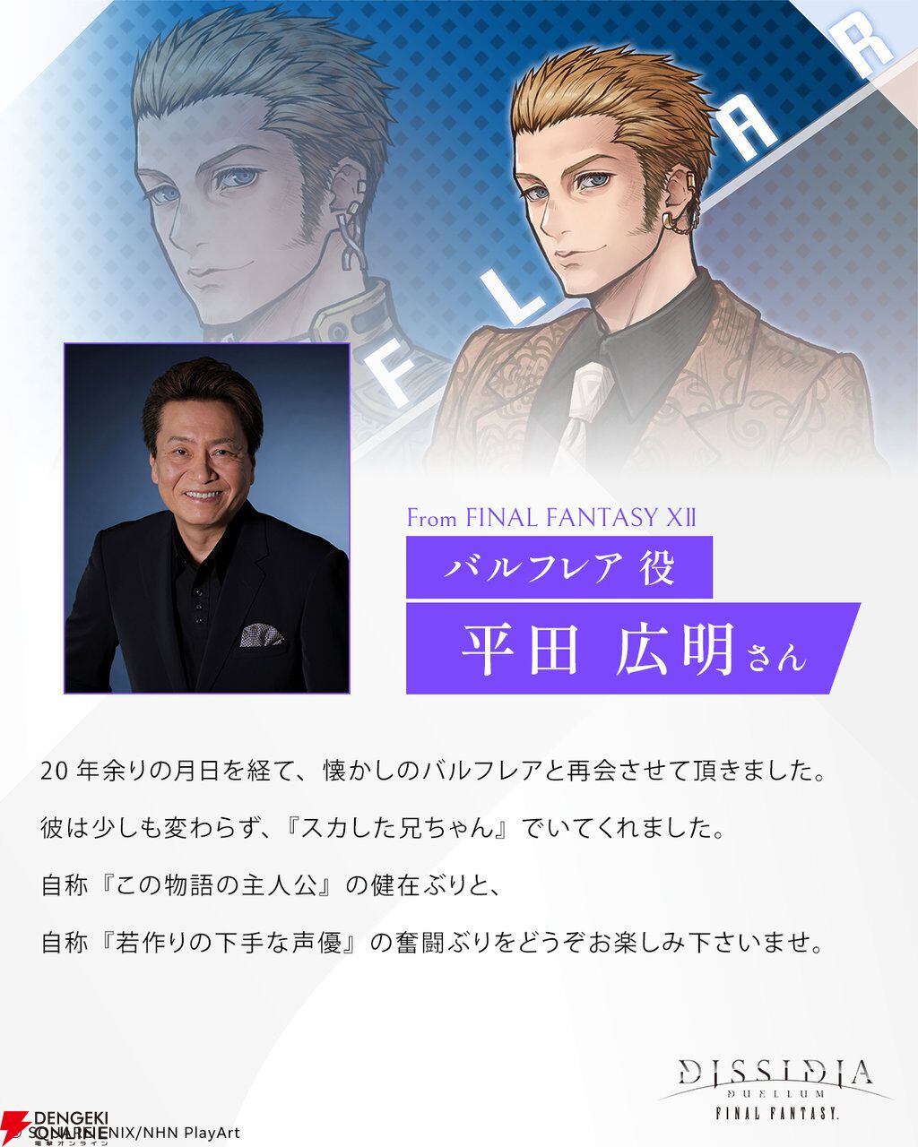 スクウェア・エニックスから配信中の『ディシディア デュエルム ファイナルファンタジー(以下、ディシディア デュエルム)』に4月14日から登場するフリオニールとバルフレアについて、キャストコメントが公開されました。