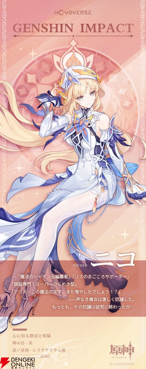 神の目は炎。月反応は起こせなさそうですが、ニコは魔女会メンバーの“コードN”でもあるので、魔導秘技の発動条件を満たせる可能性が非常に高く、魔導キャラクターたちに絡んだ編成に組みこめる期待ができそうです。