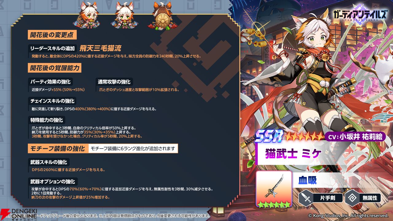 KongStudiosのスマートフォン向けゲームアプリ『ガーディアンテイルズ』において、4月15日にアップデートが実施され、英雄“猫武士 ミケ”の開花開放を含む各種コンテンツが追加されました。