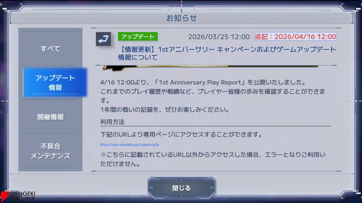 4月16日に公開された“1st Anniversary Play Report”は、これまでのプレイ履歴や戦績など、プレイヤーの歩みを確認できるコンテンツです。