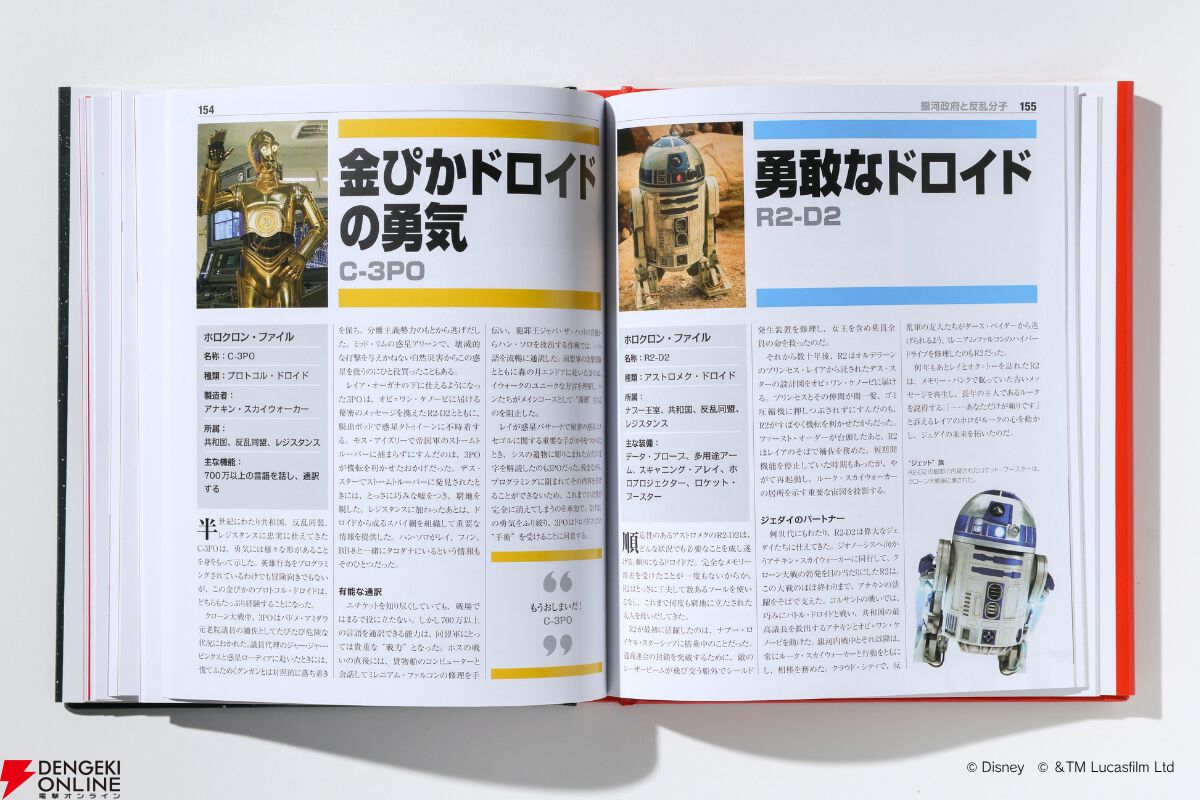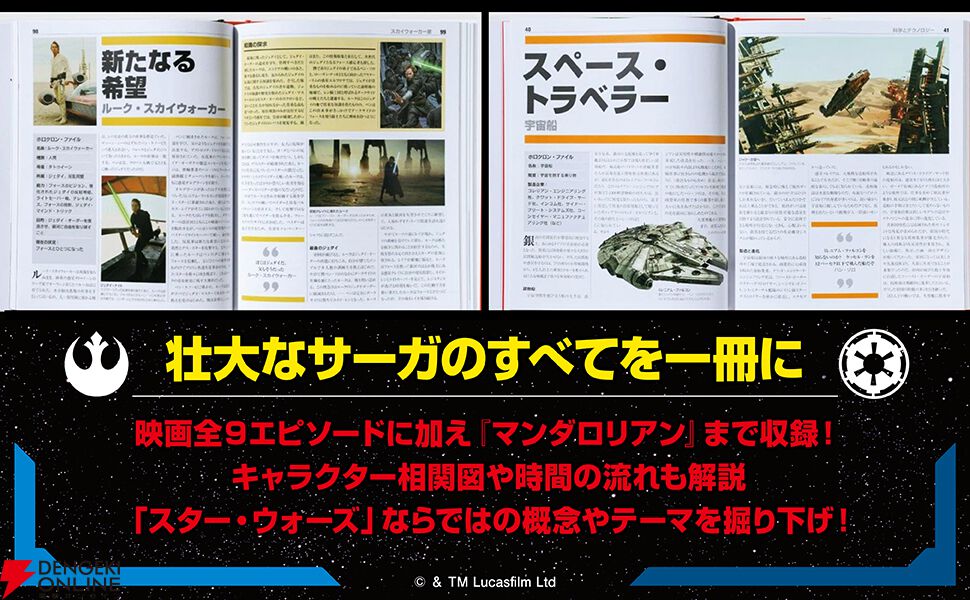 エピソード4『新たなる希望』からエピソード9『スカイウォーカーの夜明け』までに登場した主要キャラクターはもちろん、ドロイド、クリーチャー、武器、テクノロジーなど100項目近くを系統別に網羅。単なる事典にとどまらず、キャラクター相関図や時間の流れ、『スター・ウォーズ』ならではの概念やテーマまで深く掘り下げています。