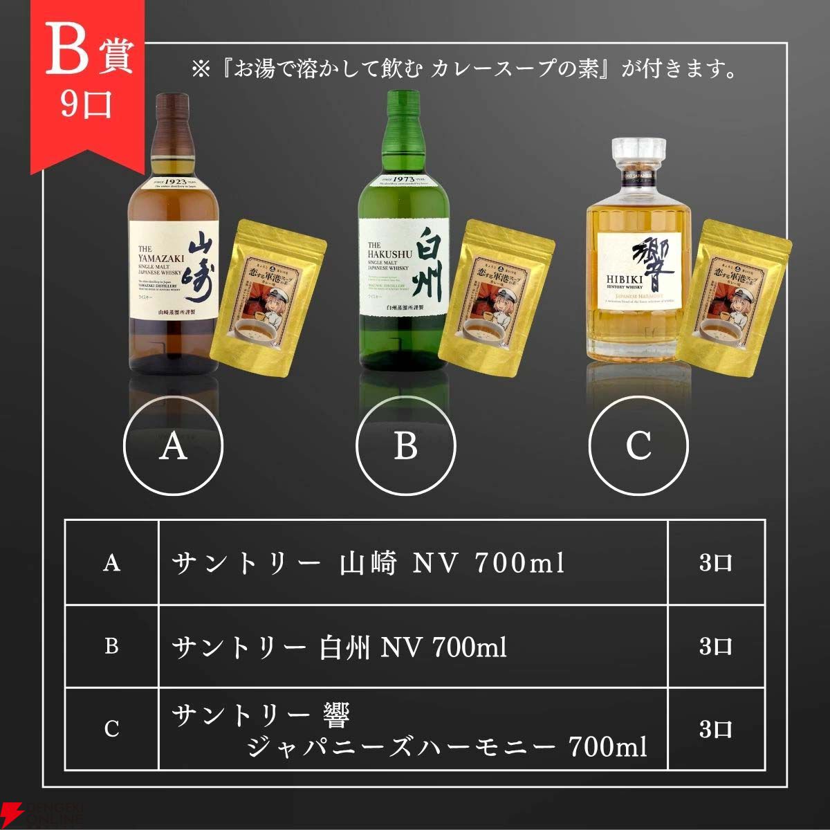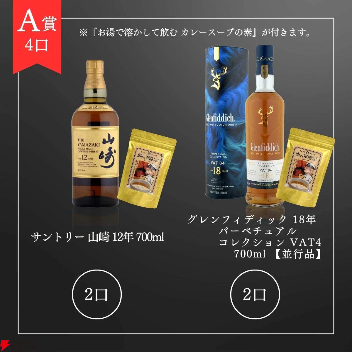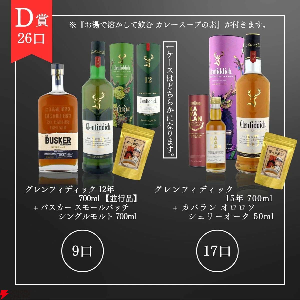また、グレンフィディック12年+バスカー スモールバッチ シングルモルトのセット、ボウモア11年は安い場合でもくじより少しだけ価格の低い銘柄。送料無料やおまけのカレースープも合わせれば、これらも当たりに入れてもいでしょう。