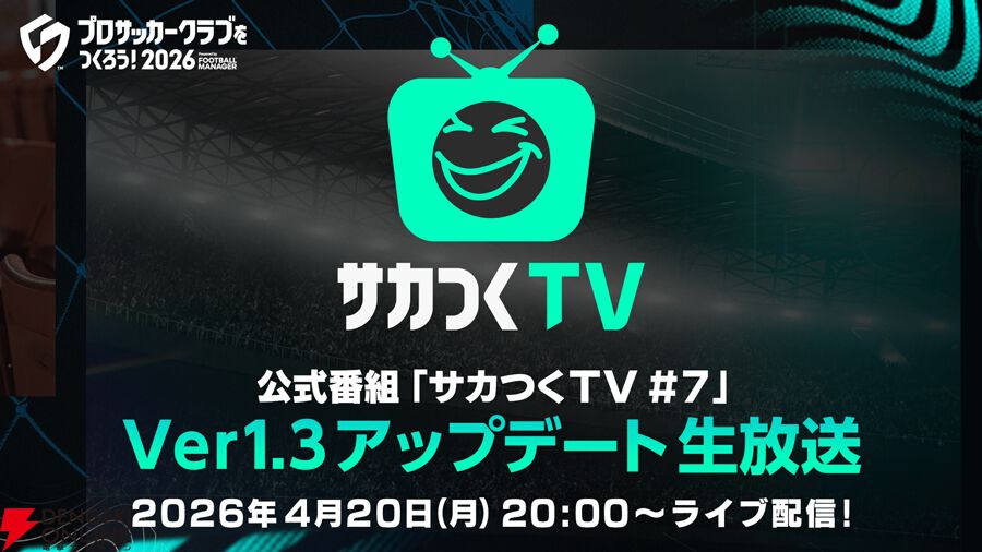 セガは、PlayStation 5/PlayStation 4/iOS/Android/PC(Steam、Google Play Games on PC)向けゲーム『プロサッカークラブをつくろう!2026』(以下『サカつく2026』)にて、最新情報をお届けする公式番組“サカつくTV#7”Ver.1.3アップデート生放送を、4月20日20:00より公式YouTubeチャンネルにて配信します。