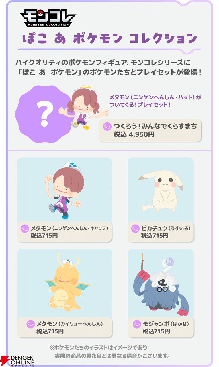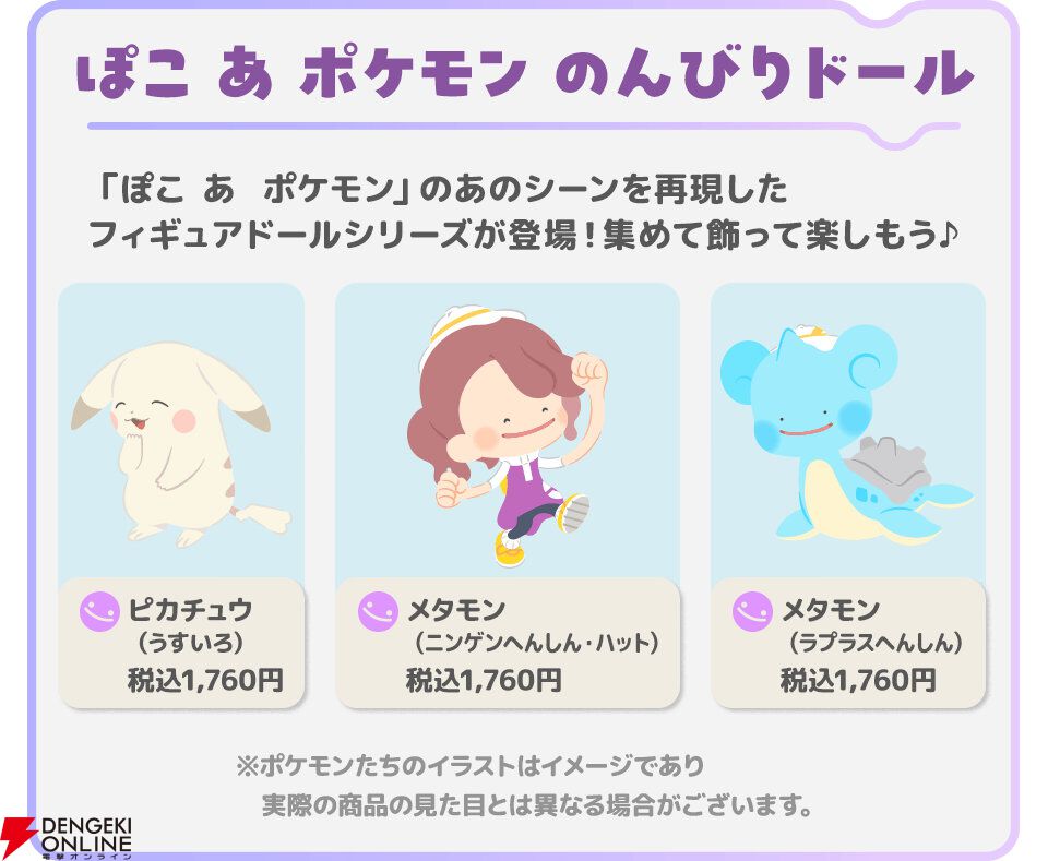 商品展開はハイクオリティなポケモンフィギュア“モンコレ”シリーズと特定のシーンを再現した“のんびりドール”の2種類。