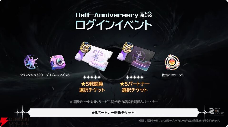 ハーフアニバのログインボーナスとして、各種アイテムのほか、星5戦闘員やパートナーを選択できるチケットも配布されます。無料で最大70連もまわせるとのことで、新規デビューのチャンスですね。