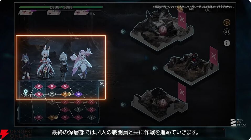 出撃で入場するカオスは外郭、中心部、深層部と3つのエリアで構成され、各エリアは9、11、13のスポットで構成。