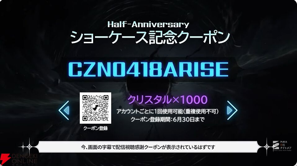 番組中には、2026年6月30日まで入力できるショーケース記念クーポンも公開されました。クリスタル1000がもらえます。