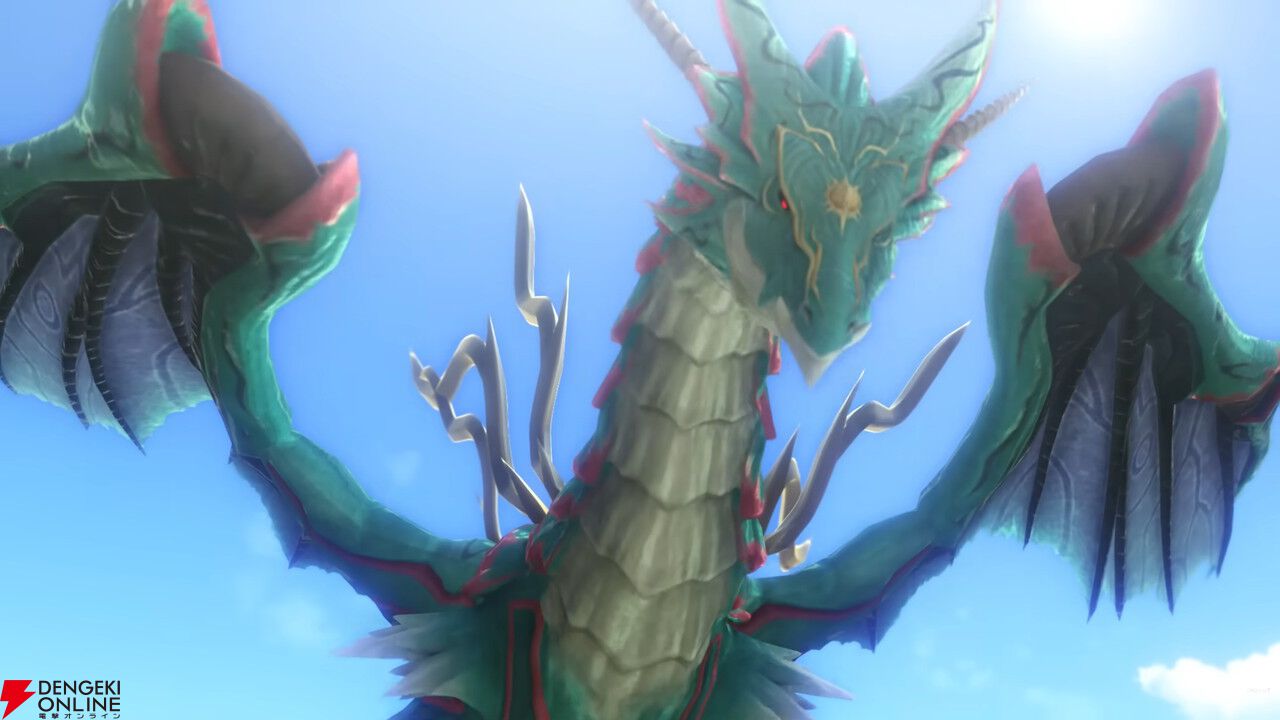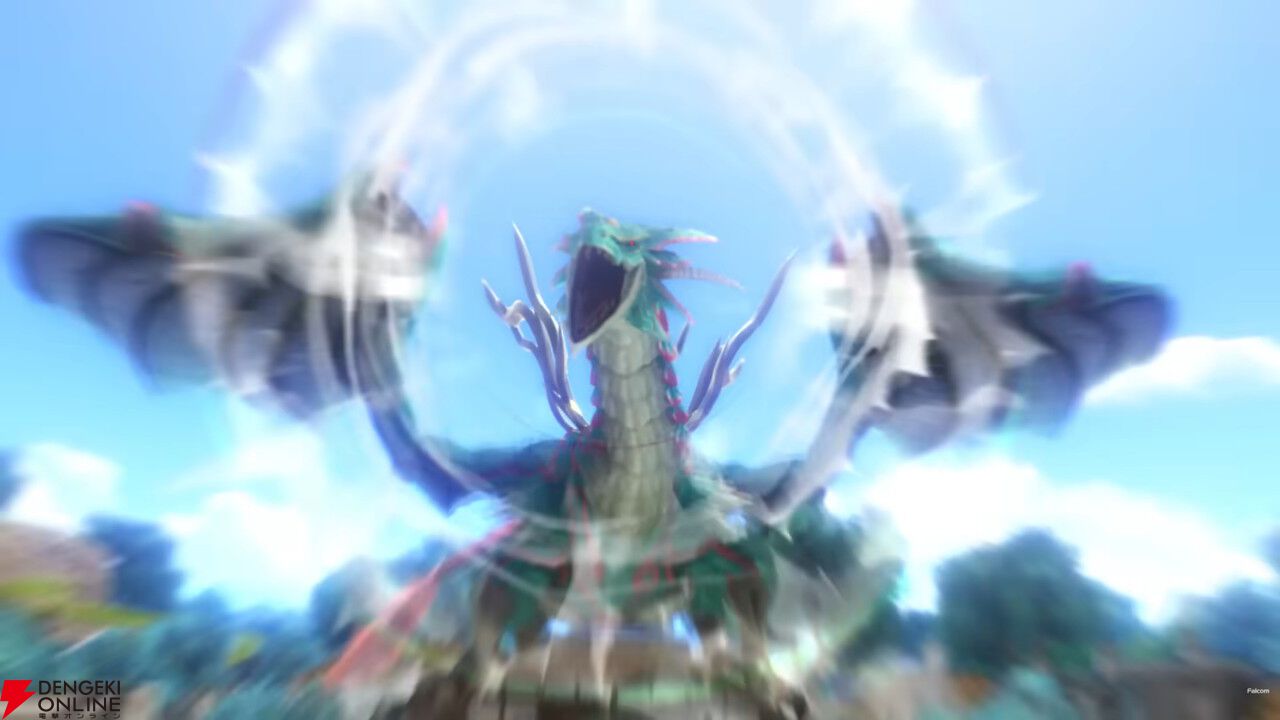商業都市ボースを襲う古竜レグナート。その威容といい、大気を震わせる咆哮といい、まさに規格外の生物であることがひと目でわかりますね。3D化で迫力は大幅に増していますし、ちゃんと暴走状態を示す赤眼になっているのも〇。