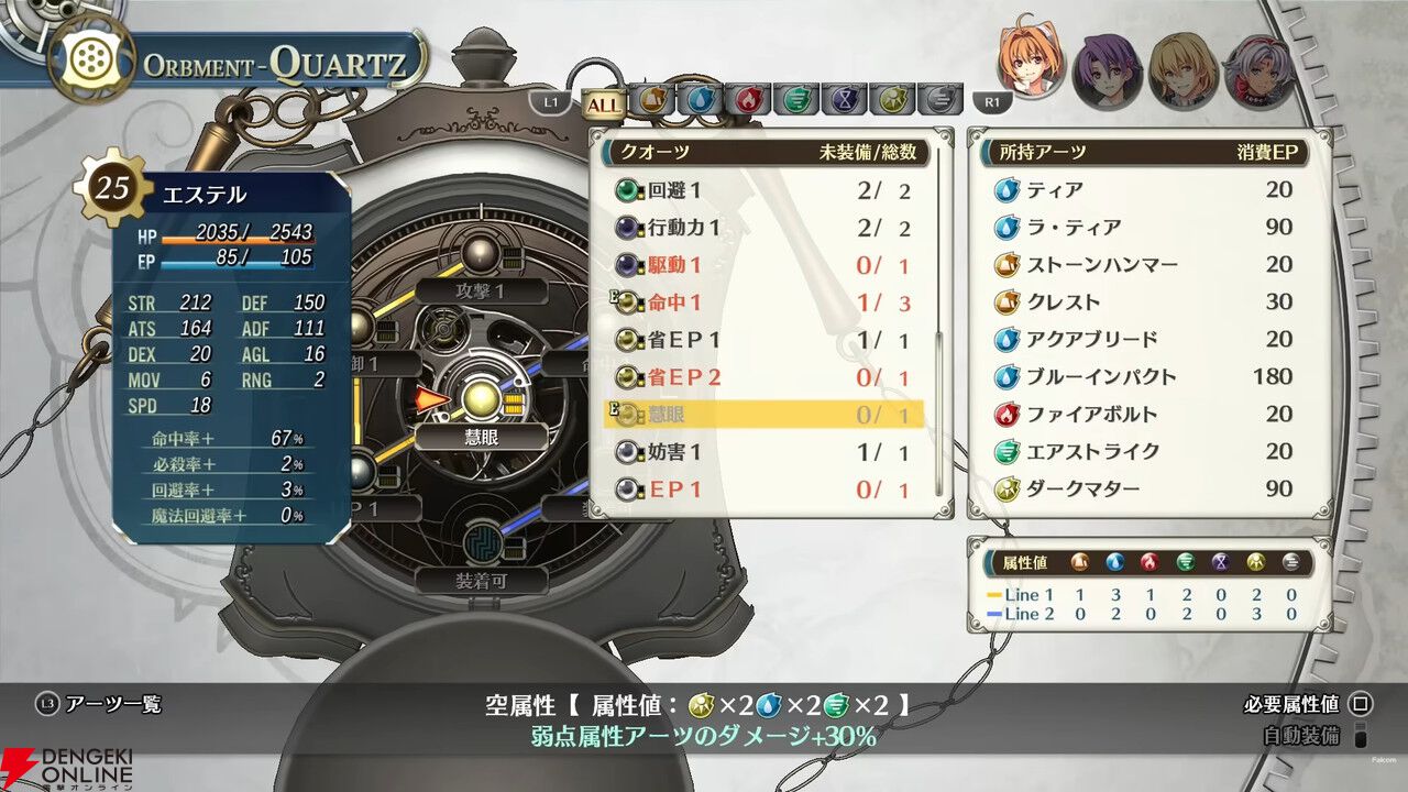 トレーラーにはオーブメントのカスタマイズ画面も入っており、“慧眼”という見慣れないクオーツがセットされていました。効果は「弱点属性アーツのダメージ+30%」。ボスを含め、大抵の敵には弱点属性が設定されているはずですし、これはかなり強力なのでは? プラスされる属性値も優秀で重宝しそう。