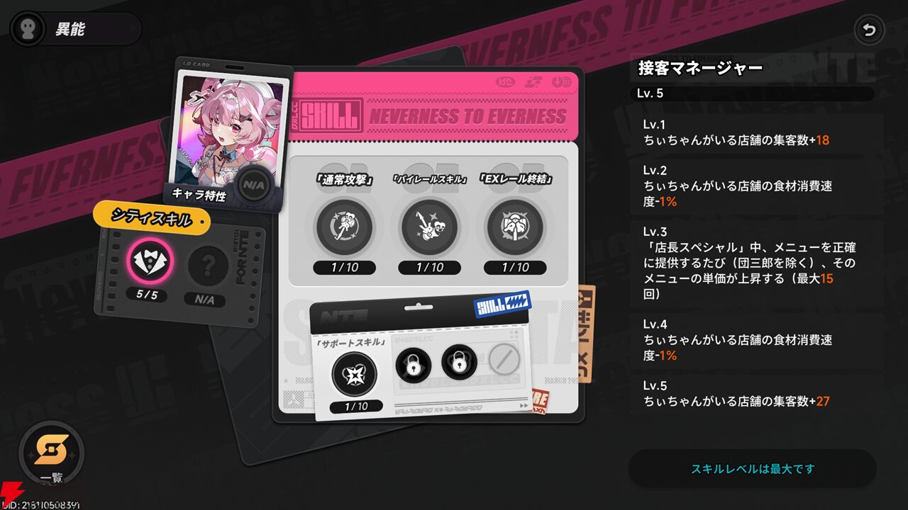 キャラクターを店員として配置することで経営できるカフェで、これだけでも十分すごいのですが、さらに驚かされたのはキャラクターにカフェ経営の専用スキルが用意されていること。