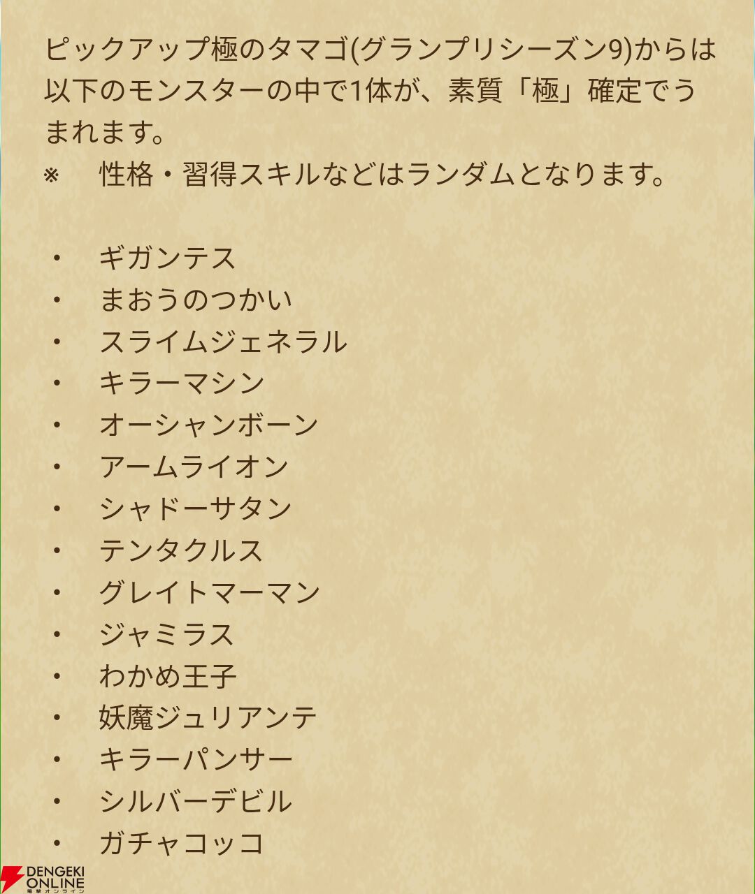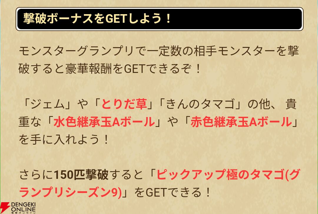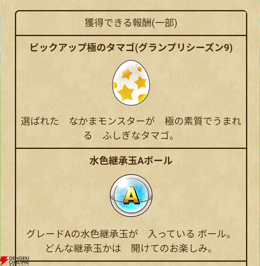 “ピックアップ極のタマゴ(グランプリシーズン9)”や継承玉Aボールなど、豪華な報酬が多数用意されています。なお、“ピックアップ極のタマゴ(グランプリシーズン9)”で生まれるモンスターも公開されています。