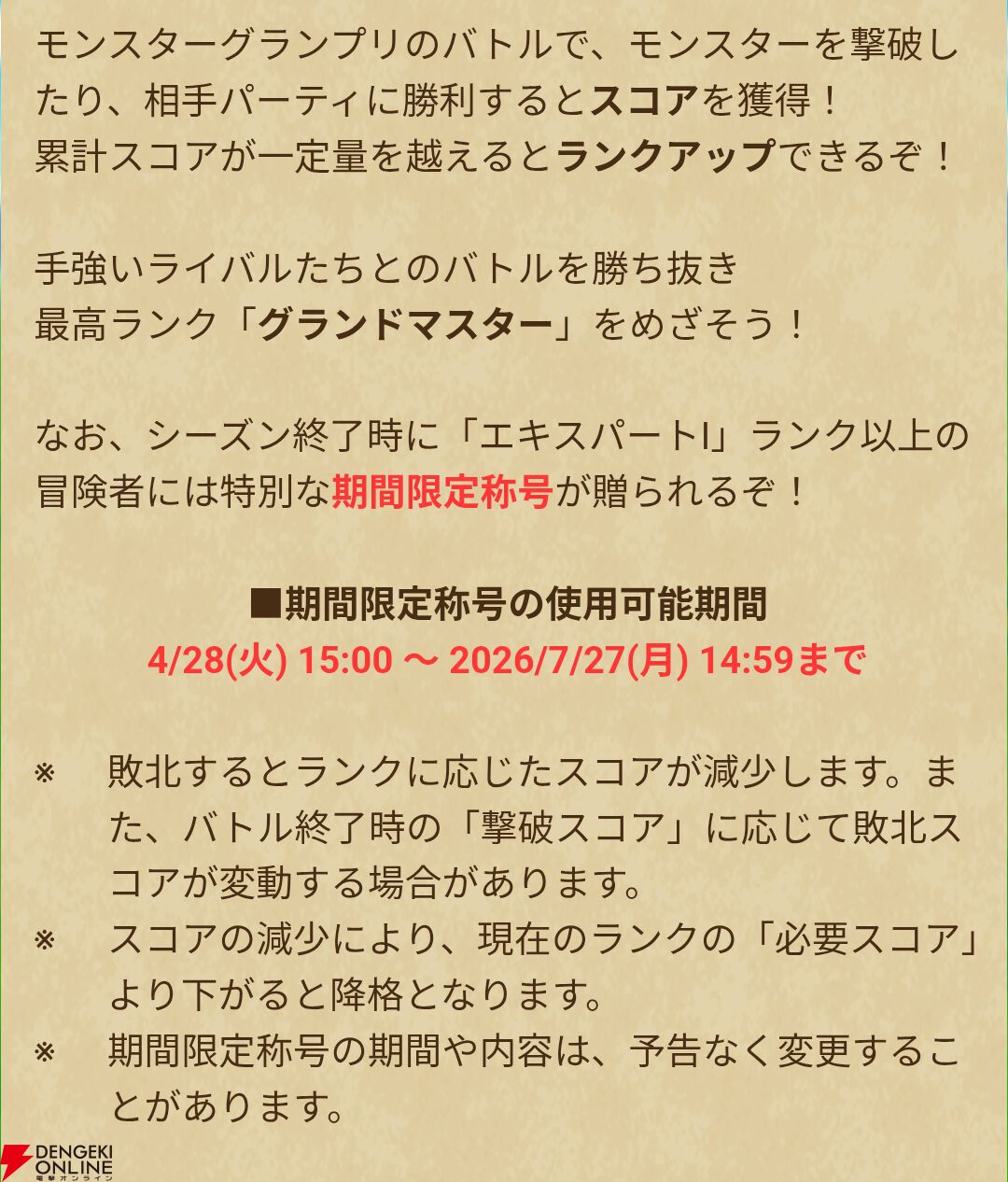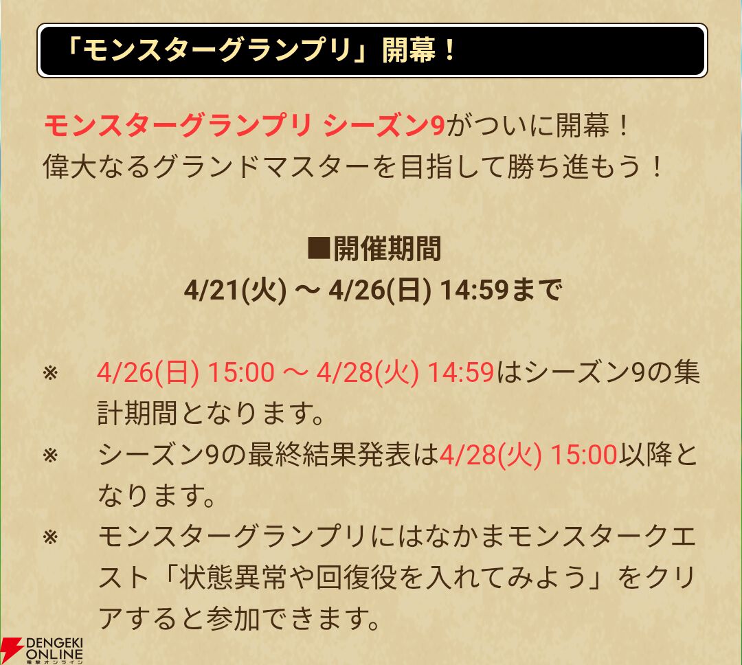 基本的なルールはこれまで実施されてきたモンスターグランプリと同じです。最終的なランクによって、さまざまな期間限定称号が獲得できるので、やり込んで最高ランクの“グランドマスター”を目指してみては?