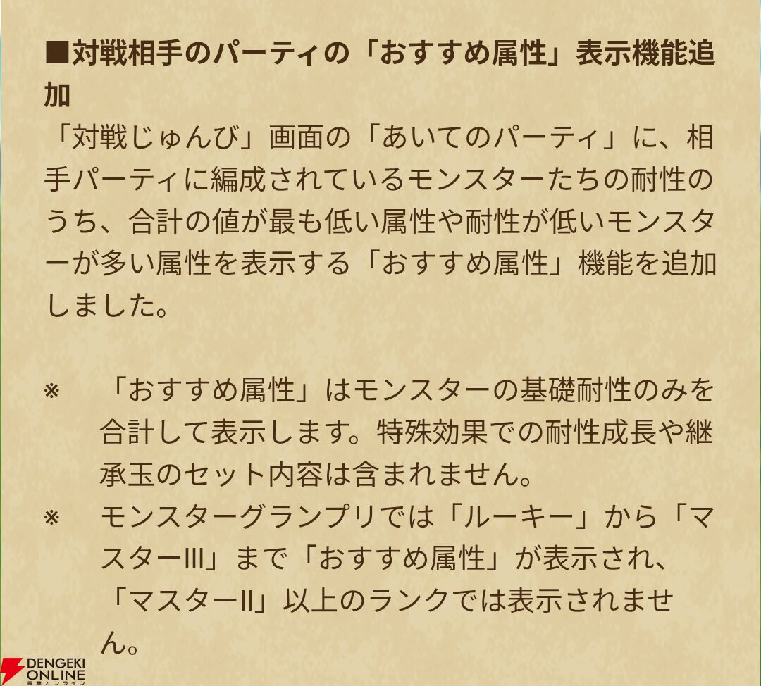 対戦じゅんび画面の“あいてのパーティ”に、おすすめ属性が表示されるようになります。相手パーティに編成されているモンスターたちの耐性のうち、合計の値が最も低い属性や耐性が多い属性が表示されます。