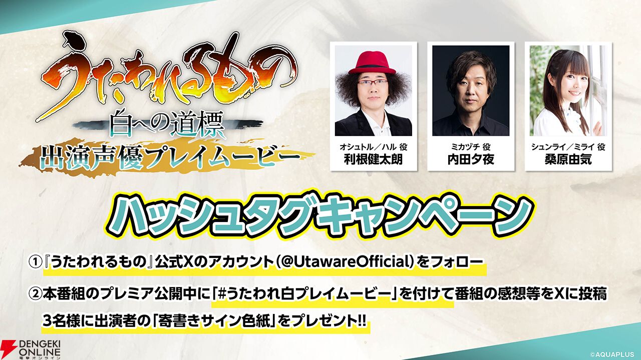 『うたわれるもの』公式Xでは、本番組配信記念としてハッシュタグキャンペーンが開催されます。ハッシュタグ“#うたわれ白プレイムービー”をつけて、本番組の感想などを投稿した方の中から、“出演者寄書きサイン色紙”が合計3名にプレゼントされます。