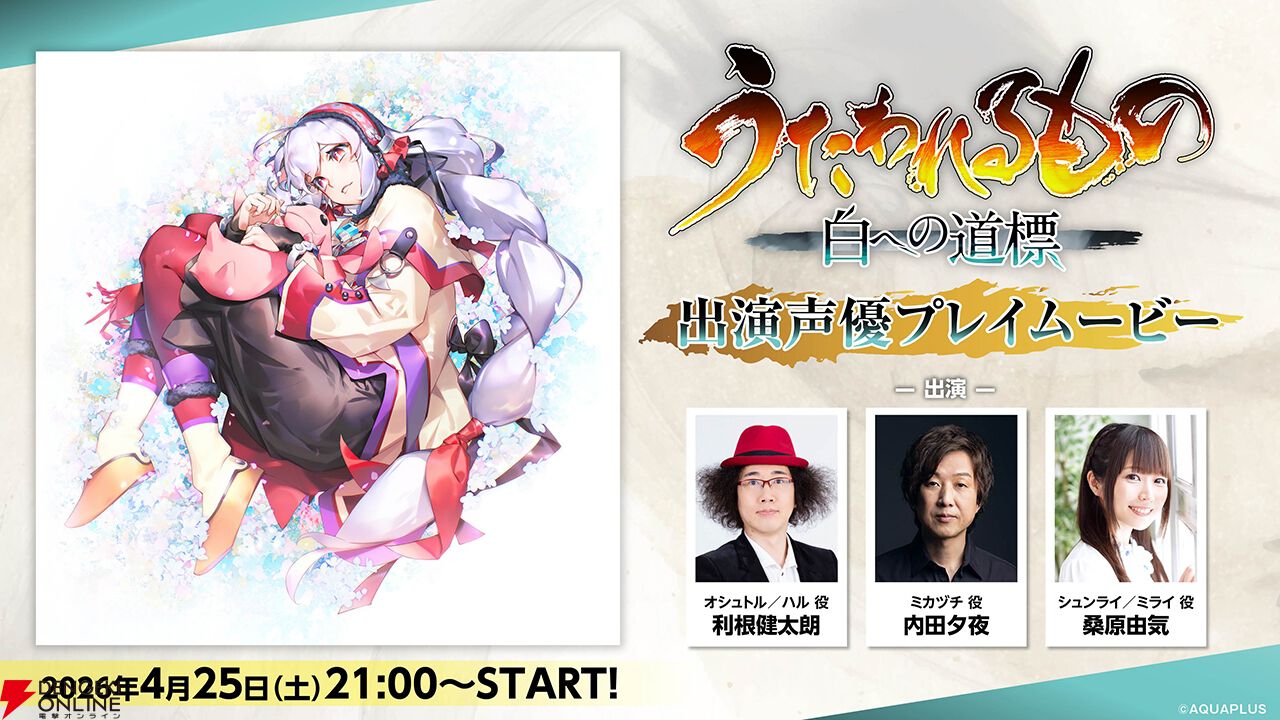 アクアプラスは、Nintendo Switch 2/PlayStation 5/Steamで発売する『うたわれるもの』シリーズ最新作『うたわれるもの 白への道標』(5月28日発売予定)にて、本作の出演声優による番組“『うたわれるもの 白への道標』出演声優プレイムービー”を4月25日21:00より配信することを発表しました。