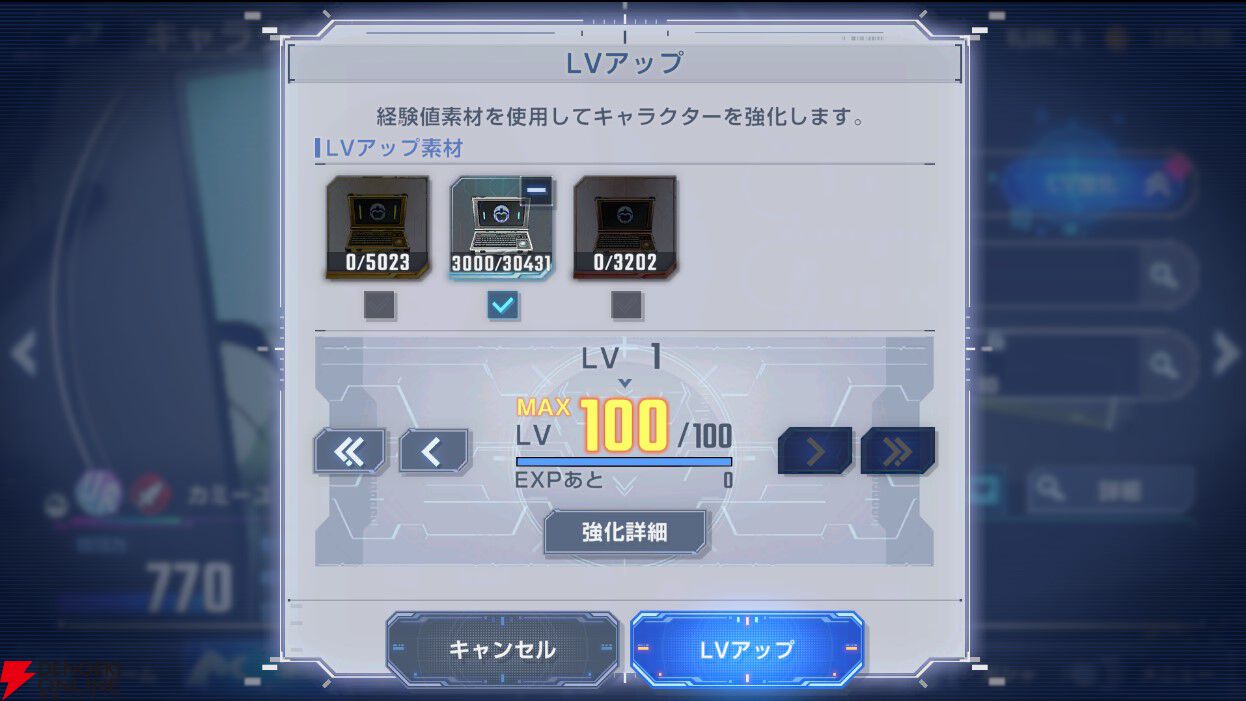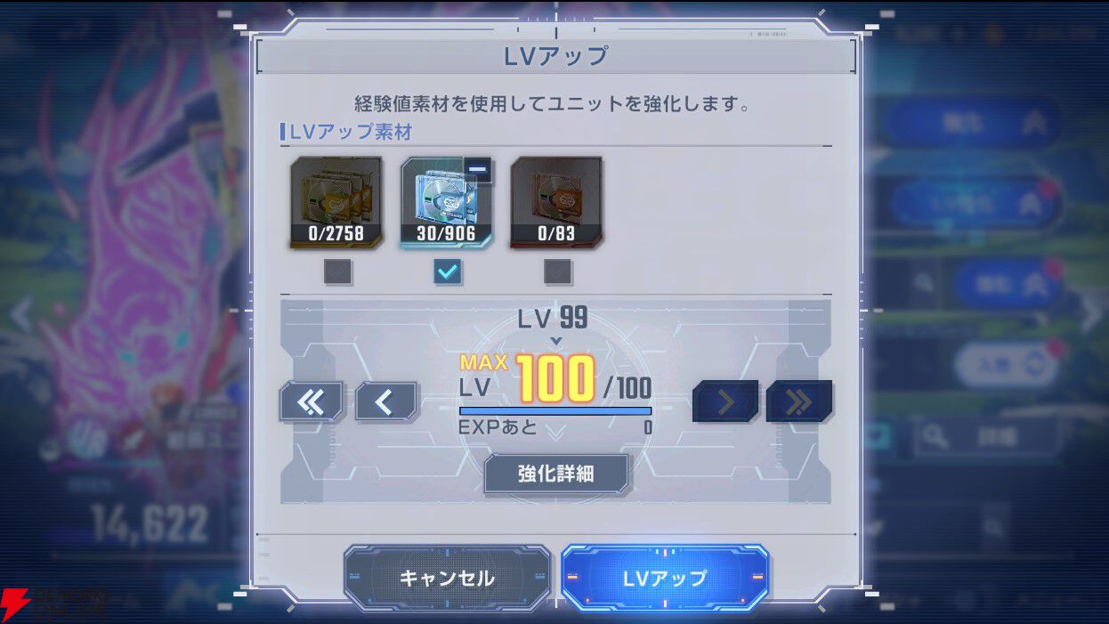 また、SSR素材でLV99まで上げた後、残りをSRやR素材の一括使用でLV100にするといった、細かい調整も非常にスムーズに行えます。