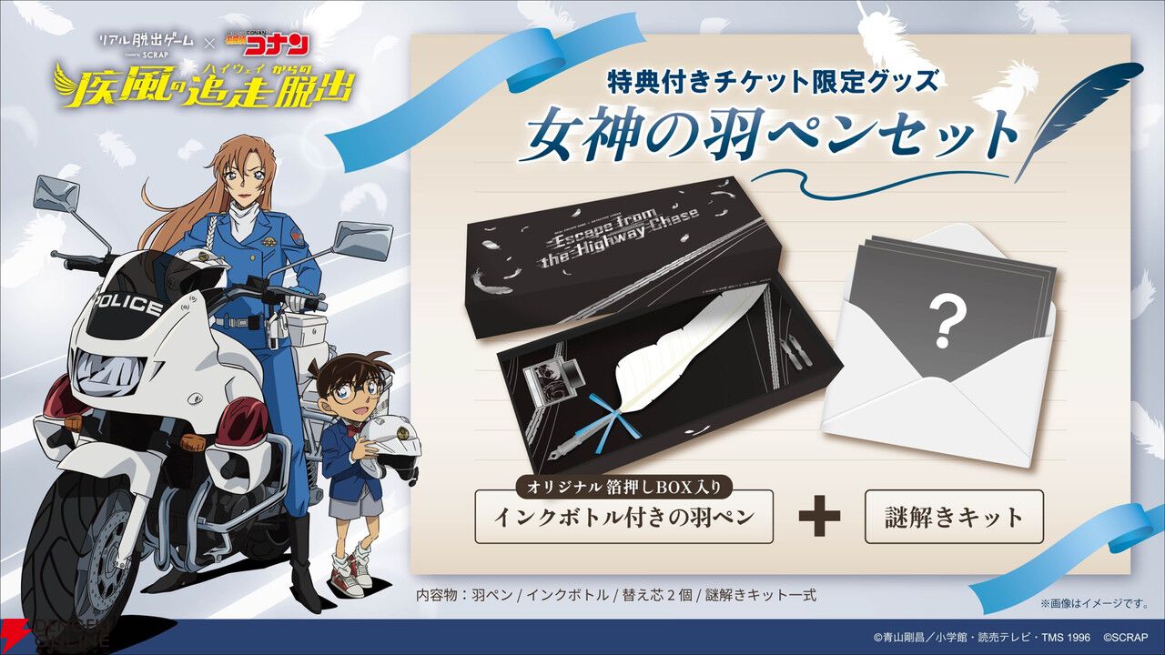 特典付きチケット限定グッズには、オリジナル箔押しBOX入りのインクボトル付きの本格的な羽ペンと謎解きキットがセットになった「女神の羽ペンセット」がついてきます。