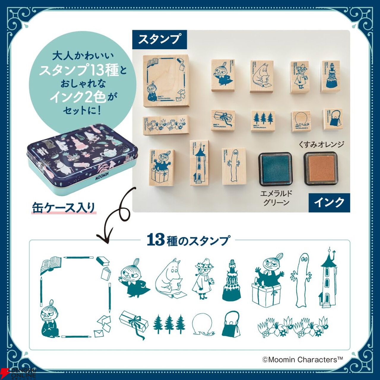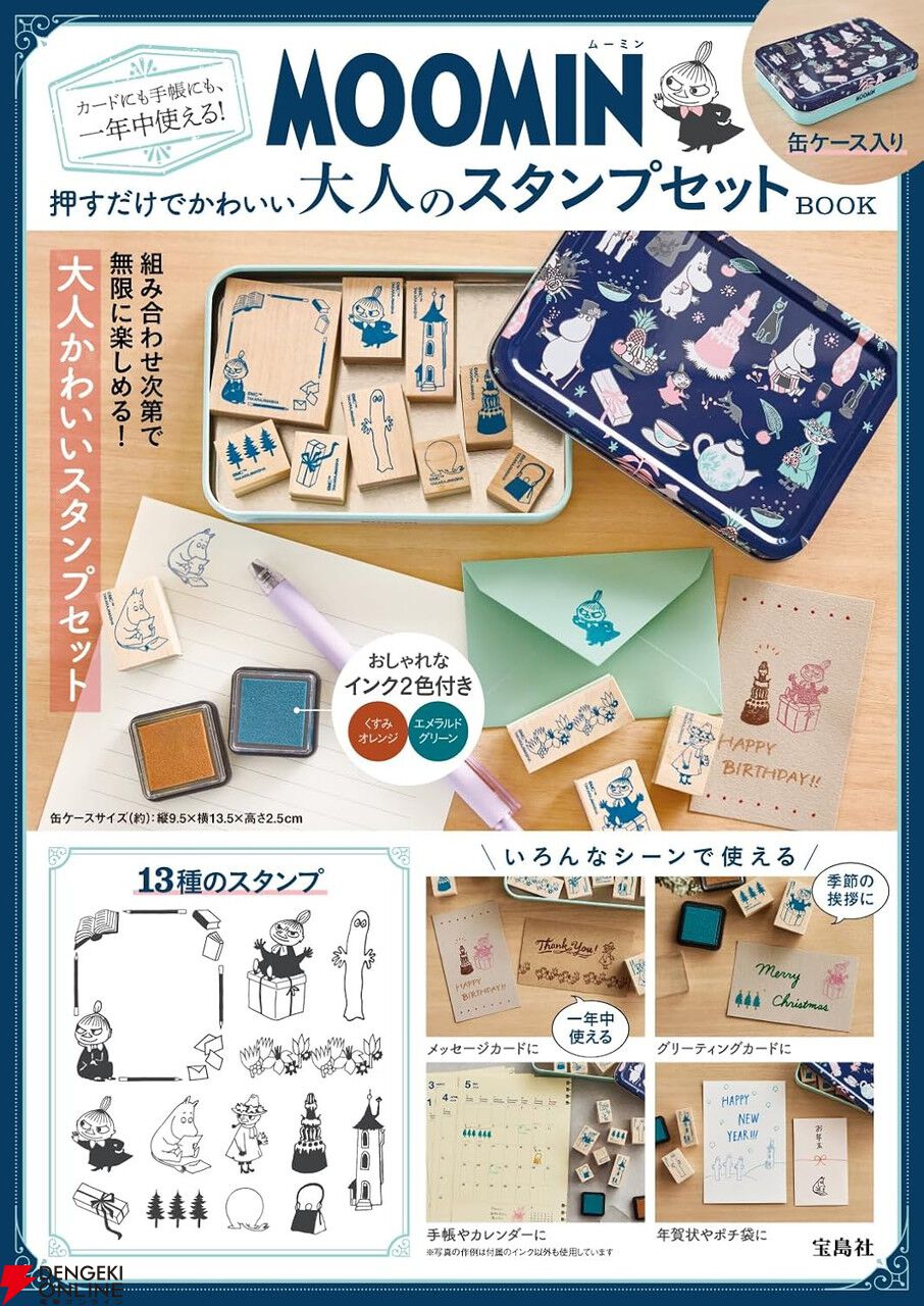 楽天市場で他のお店も探すムーミンのスタンプセットが付いたムックです。スタンプセットは、13種類のスタンプと2種類のインクが専用の缶ケースに入って付属。
