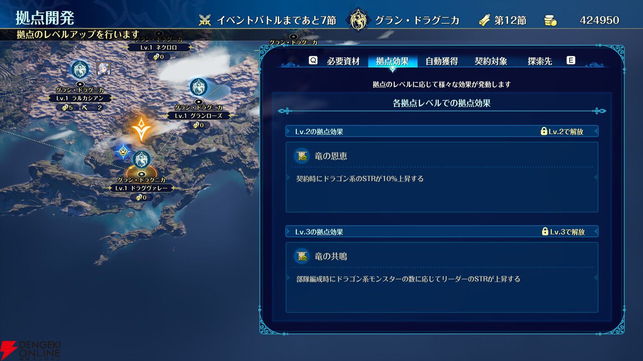 必要な資材を準備して各拠点のレベルを上げることで、自軍全体にさまざまなプラス効果をもたらします。