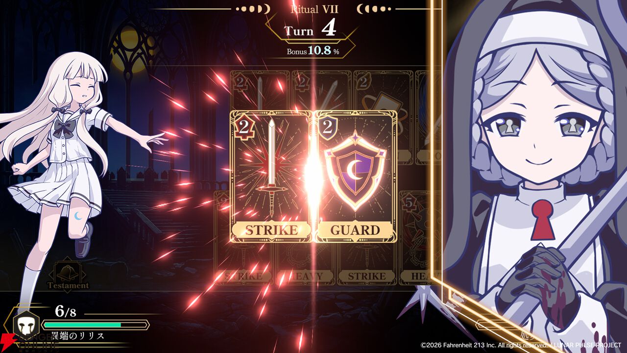 その夜、十三人の魔女が喰らい合う―。『ルナパルス』はシングルプレイヤーのローグライトカードゲームです。明けない月夜を舞台に繰り広げられる、生殺与奪をかけた魔女たちの儀式。互いの手札がすべて見えた状態で同時に一手を仕掛ける。たった一手が即死を招く、“死にゲー”さながらの緊張感をカードバトルで味わえます。