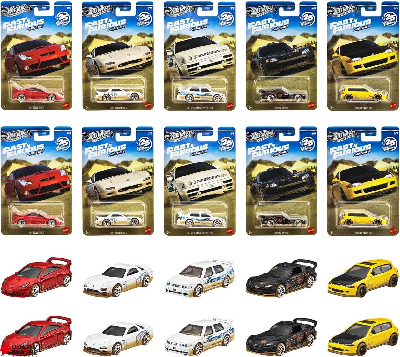 トヨタ セリカ、1995 マツダ RX-7、フォルクスワーゲン ジェッタ MK3、ホンダ S2000、ホンダ シビック EGと5車種が2つずつ、全10台がセットになっています。