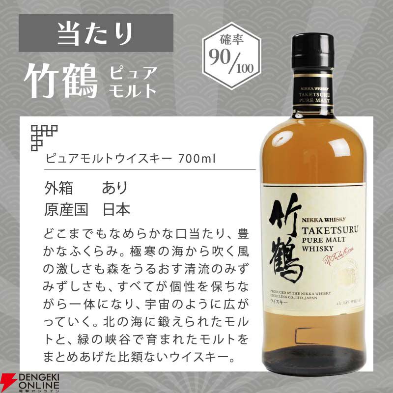 ハズれの竹鶴は安い場合で7,000円ほど。前回のハズれには知多が入っていたので、竹鶴のみとなったことでかなり最低保証が強化された形ですね。