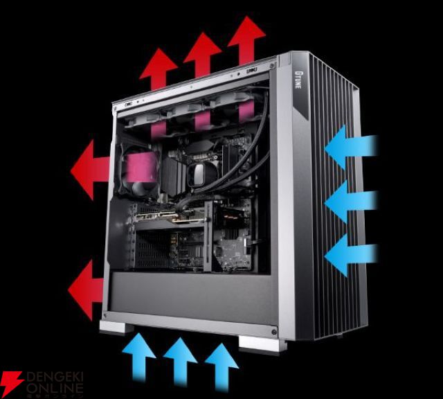 G TUNE FZシリーズの筐体は、フロントからのエアフローにも考慮したスリットデザインに、最大で7基の空冷ファンと2基の大型360mm水冷ラジエーターを搭載可能な設計を採用しました。