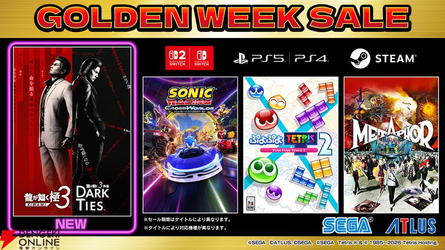 株式会社セガは、Playstation Storeおよびニンテンドーeショップ、Steamにて販売中の一部Playstation 5/Playstation 4/Nintendo Switch 2/Steam用タイトルを対象として、期間限定で特別価格にて販売する”セガGWセール”を開催中です。