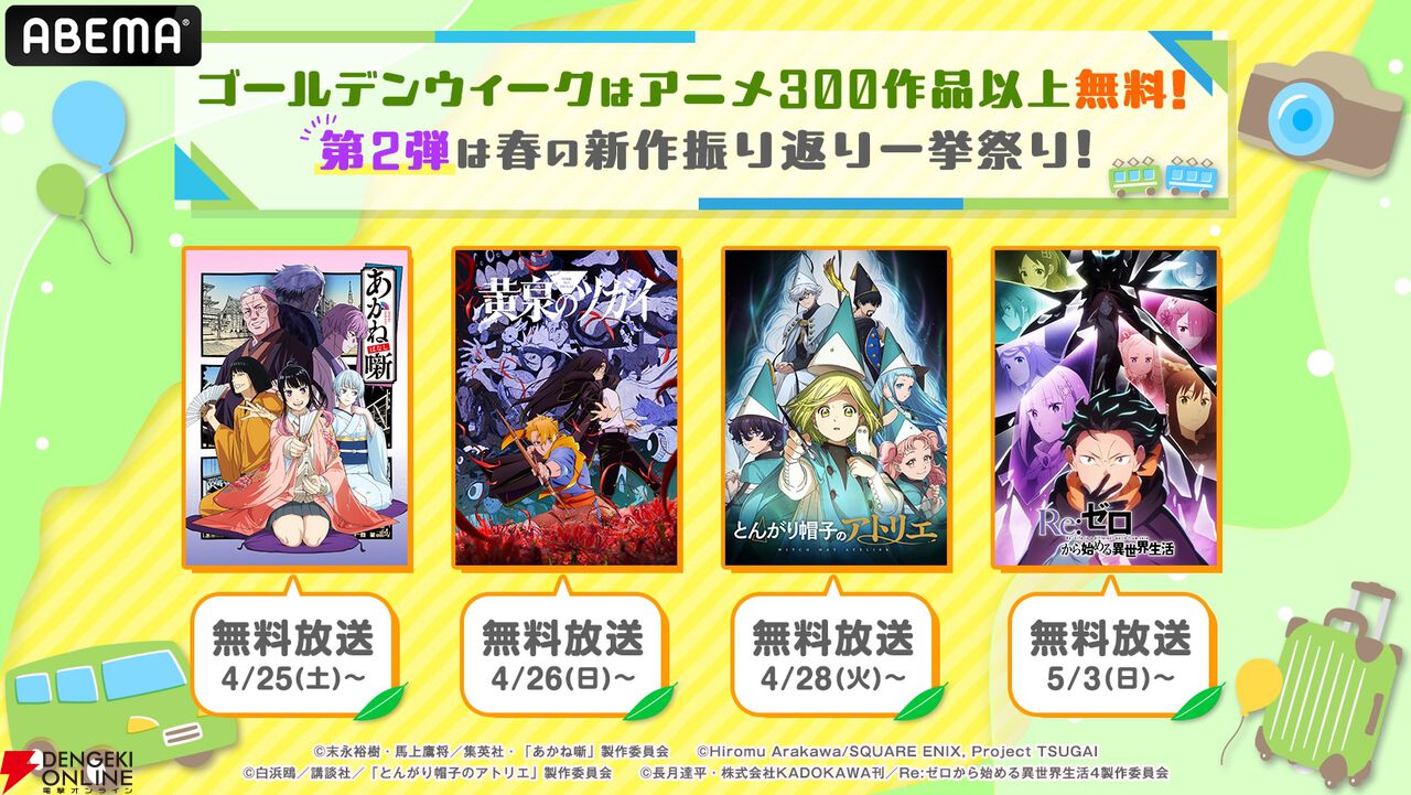 『ABEMA』は、ゴールデンウィーク特別企画”アニメ300作品以上無料大放出祭”の一環として、2026年4月25日(土)より、新作春アニメ40作品超の無料振り返り一挙放送を実施します。