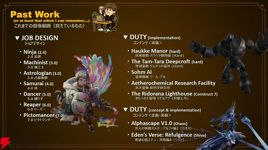 スライドで玉置氏の経歴が掲載されたのだが、かつて多くの光の戦士に“素数”を叩き込んだ“労働七号”のギミックを作り上げた人物と発覚して会場が盛り上がったのだ。