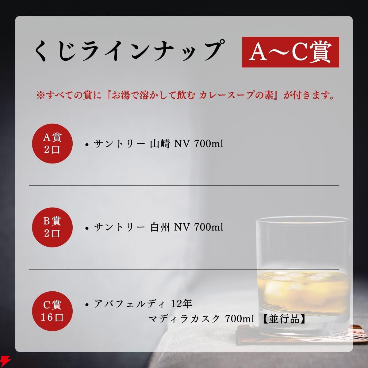 また、おまけのカレースープと送料分も合わせれば。アバフェルディ12年マディラカスクも十分にくじの価格より上となりますので、今回は100%当たりのハズれなし回といっていいですね。