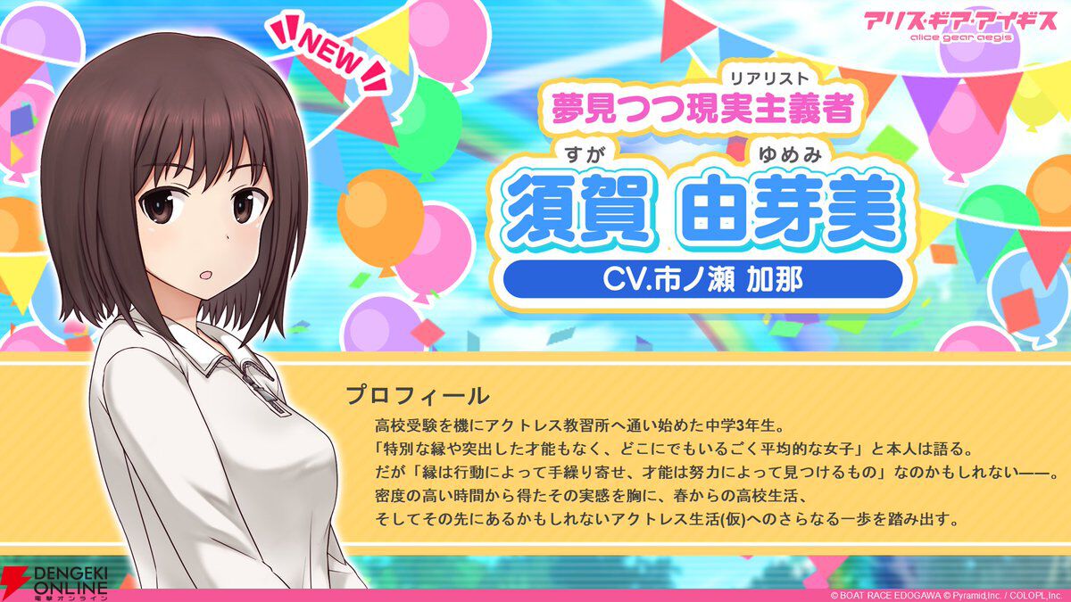 コロプラの、スマートフォン向けゲーム『アリス・ギア・アイギス(以下、アリスギア)』で須賀 由芽美(声優:市ノ瀬加那)が決定しました。