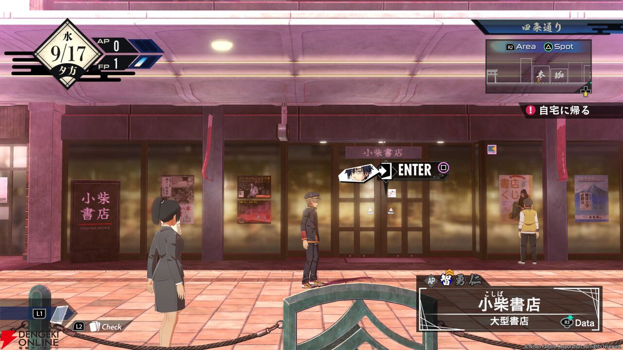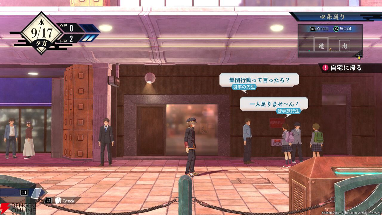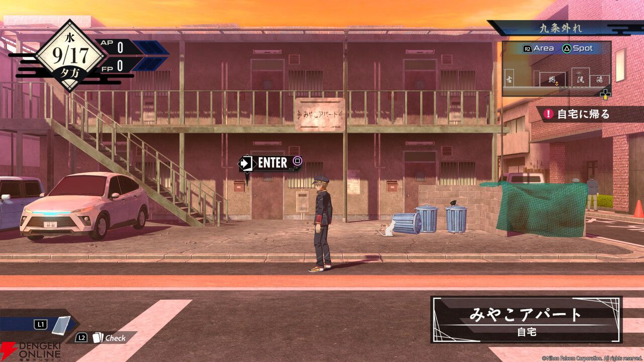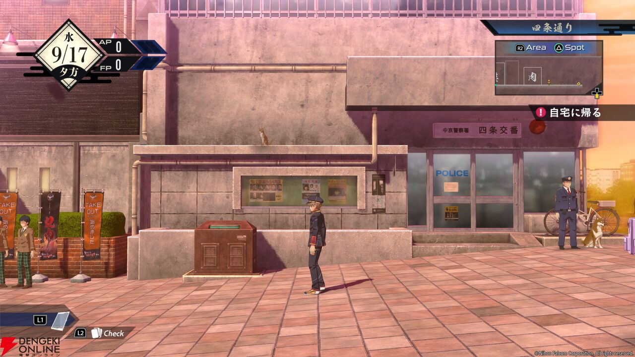 ちなみに、レイの自宅であるアパートに戻れば、ストーリーを進めて迷宮探索やバトルに挑むことも可能です。とはいえせっかく“亰都観光コース”と銘打たれているので、今回は観光に集中してプレイしました。まずは行けるエリアの紹介から!