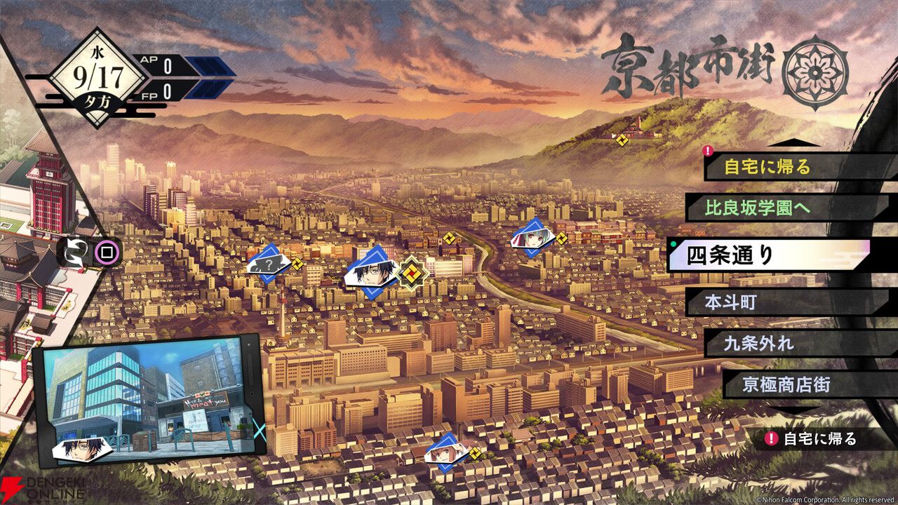閉じる古き良き伝統を残す亰都の各地をめぐる“亰都観光コース”。実在の京都モチーフの名所も多数