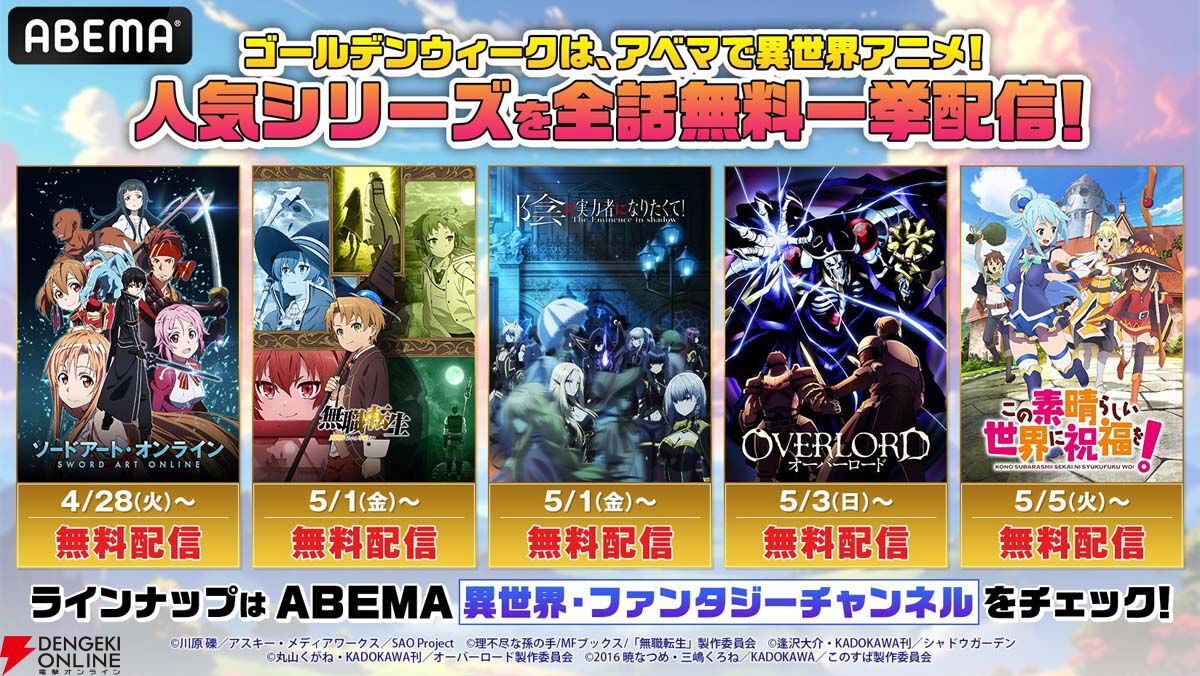 ~ゴールデンウィークは、ABEMAで”アニメ300作品以上無料大放出祭”!~『SAO』『無職転生』『このすば』『オーバーロード』『陰の実力者になりたくて!』ほか人気の異世界アニメ11シリーズが集結!