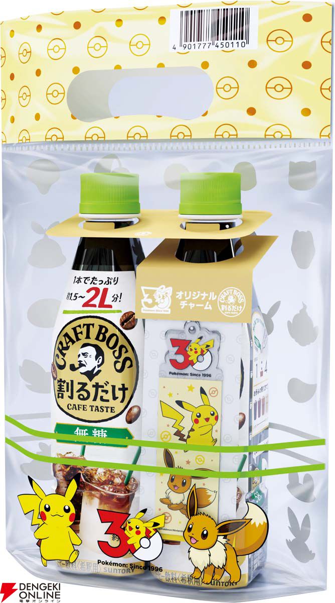 今回、『割るだけクラフトボスカフェ 2本パック』(無糖/甘さ控えめの2種)に“ポケモン30周年記念オリジナルチャーム”が付いた商品※が5月19日(火)に発売されます。